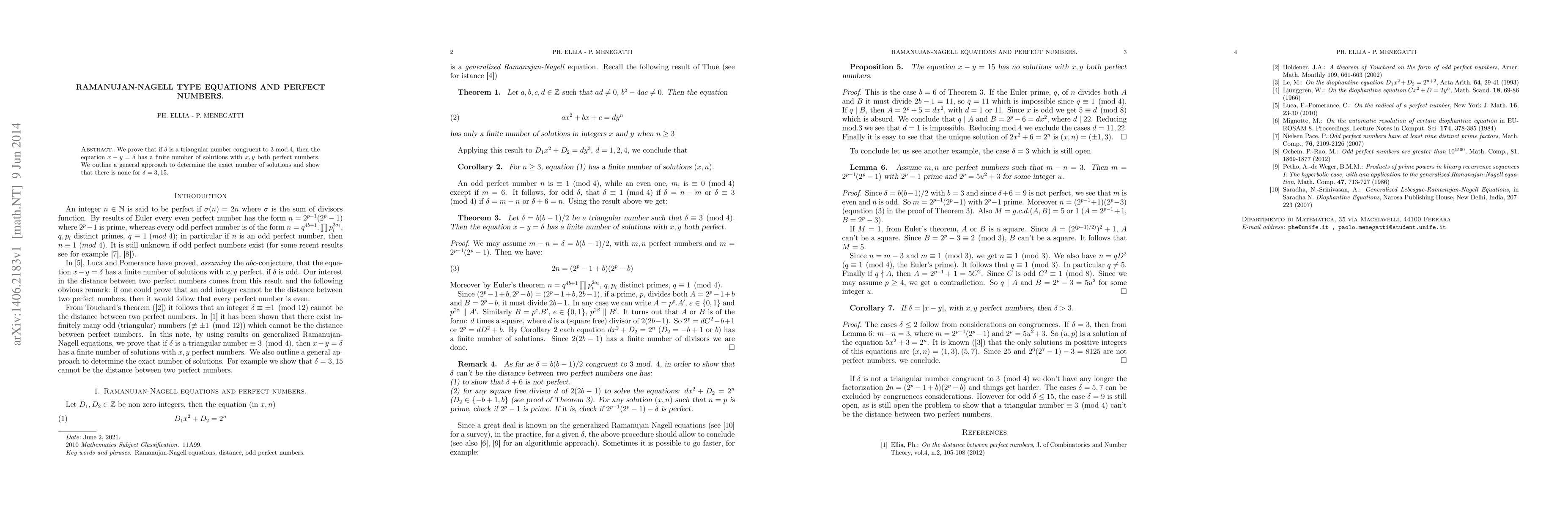 Summary: This paper investigates the relationship between Ramanujan-Nagell type equations and the distance between two perfect numbers, providing new insights into their properties. The findings contribute to the understanding of perfect numbers through the lens of these specific types of equations.