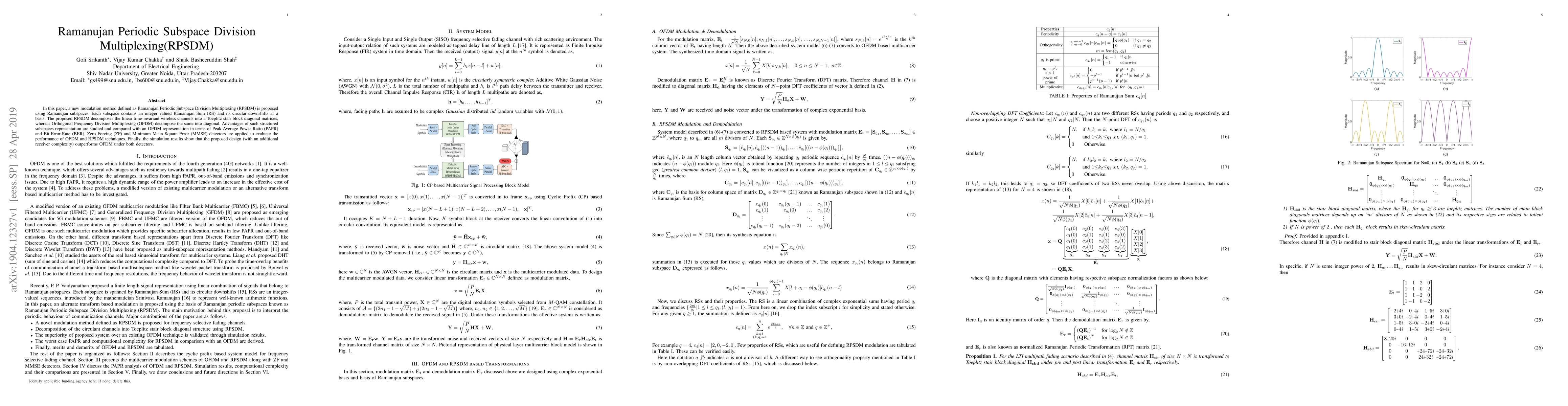 In this paper, a new modulation method defined as Ramanujan Periodic Subspace Division Multiplexing (RPSDM) is proposed using Ramanujan subspaces. Each subspace contains an integer valued Ramanujan Sum (RS) and its circular downshifts as a basis. The proposed RPSDM decomposes the linear time-invariant wireless channels into a Toeplitz stair block diagonal matrices, whereas Orthogonal Frequency Division Multiplexing (OFDM) decompose the same into diagonal. Advantages of such structured subspaces representation are studied and compared with an OFDM representation in terms of Peak-Average Power Ratio (PAPR) and Bit-Error-Rate (BER). Zero Forcing (ZF) and Minimum Mean Square Error (MMSE) detectors are applied to evaluate the performance of OFDM and RPSDM techniques. Finally, the simulation results show that the proposed design (with an additional receiver complexity) outperforms OFDM under both detectors.
