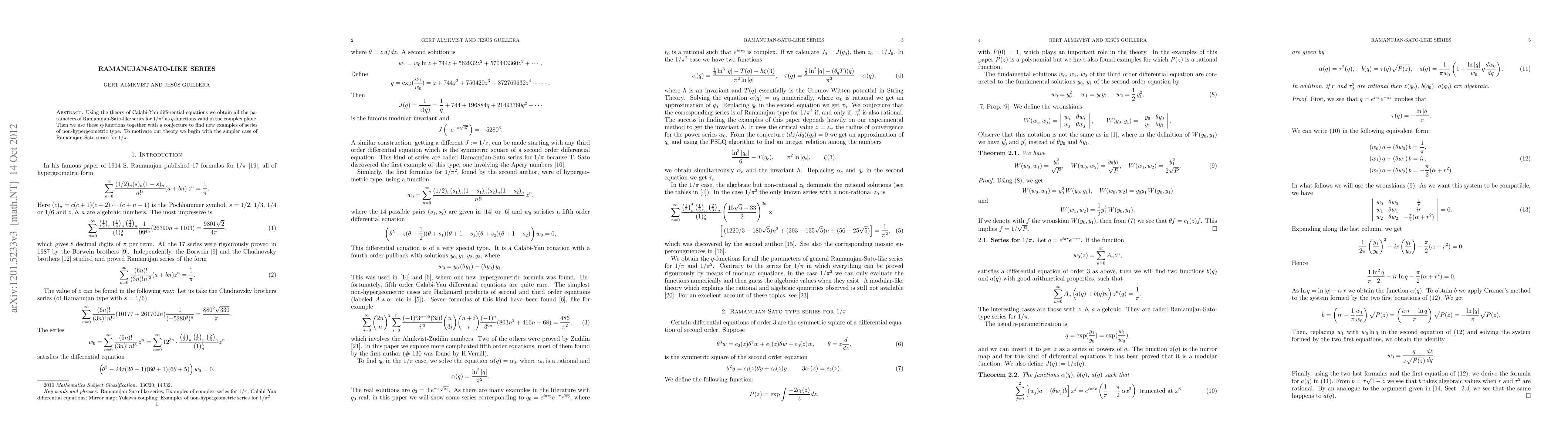 Using the theory of Calabi-Yau differential equations we obtain all the parameters of Ramanujan-Sato-like series for $1/\pi^2$ as $q$-functions valid in the complex plane. Then we use these q-functions together with a conjecture to find new examples of series of non-hypergeometric type. To motivate our theory we begin with the simpler case of Ramanujan-Sato series for $1/\pi$.