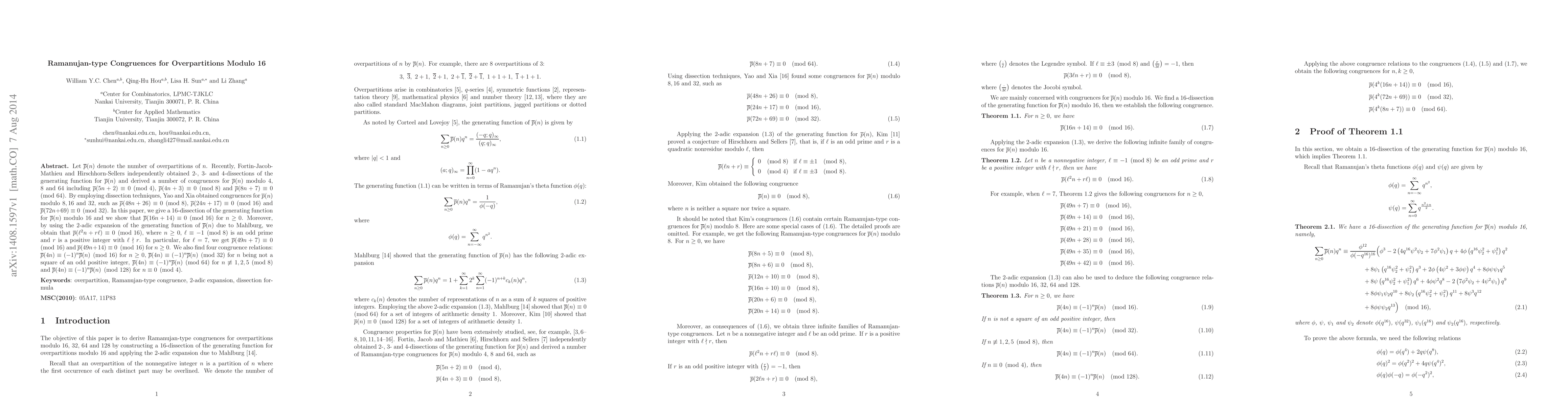 Let $\overline{p}(n)$ denote the number of overpartitions of $n$. Recently, Fortin-Jacob-Mathieu and Hirschhorn-Sellers independently obtained 2-, 3- and 4-dissections of the generating function for $\overline{p}(n)$ and derived a number of congruences for $\overline{p}(n)$ modulo $4$, $8$ and $64$ including $\overline{p}(5n+2)\equiv 0 \pmod{4}$, $\overline{p}(4n+3)\equiv 0 \pmod{8}$ and $\overline{p}(8n+7)\equiv 0 \pmod{64}$. By employing dissection techniques, Yao and Xia obtained congruences for $\overline{p}(n)$ modulo $8, 16$ and $32$, such as $\overline{p}(48n+26) \equiv 0 \pmod{8}$, $\overline{p}(24n+17)\equiv 0 \pmod{16}$ and $\overline{p}(72n+69)\equiv 0 \pmod{32}$. In this paper, we give a 16-dissection of the generating function for $\overline{p}(n)$ modulo 16 and we show that $\overline{p}(16n+14)\equiv0\pmod{16}$ for $n\ge 0$. Moreover, by using the $2$-adic expansion of the generating function of $\overline{p}(n)$ due to Mahlburg, we obtain that $\overline{p}(\ell^2n+r\ell)\equiv0\pmod{16}$, where $n\ge 0$, $\ell \equiv -1\pmod{8}$ is an odd prime and $r$ is a positive integer with $\ell \nmid r$. In particular, for $\ell=7$, we get $\overline{p}(49n+7)\equiv0\pmod{16}$ and $\overline{p}(49n+14)\equiv0\pmod{16}$ for $n\geq 0$. We also find four congruence relations: $\overline{p}(4n)\equiv(-1)^n\overline{p}(n) \pmod{16}$ for $n\ge 0$, $\overline{p}(4n)\equiv(-1)^n\overline{p}(n)\pmod{32}$ for $n$ being not a square of an odd positive integer, $\overline{p}(4n)\equiv(-1)^n\overline{p}(n)\pmod{64}$ for $n\not\equiv 1,2,5\pmod{8}$ and $\overline{p}(4n)\equiv(-1)^n\overline{p}(n)\pmod{128}$ for $n\equiv 0\pmod{4}$.