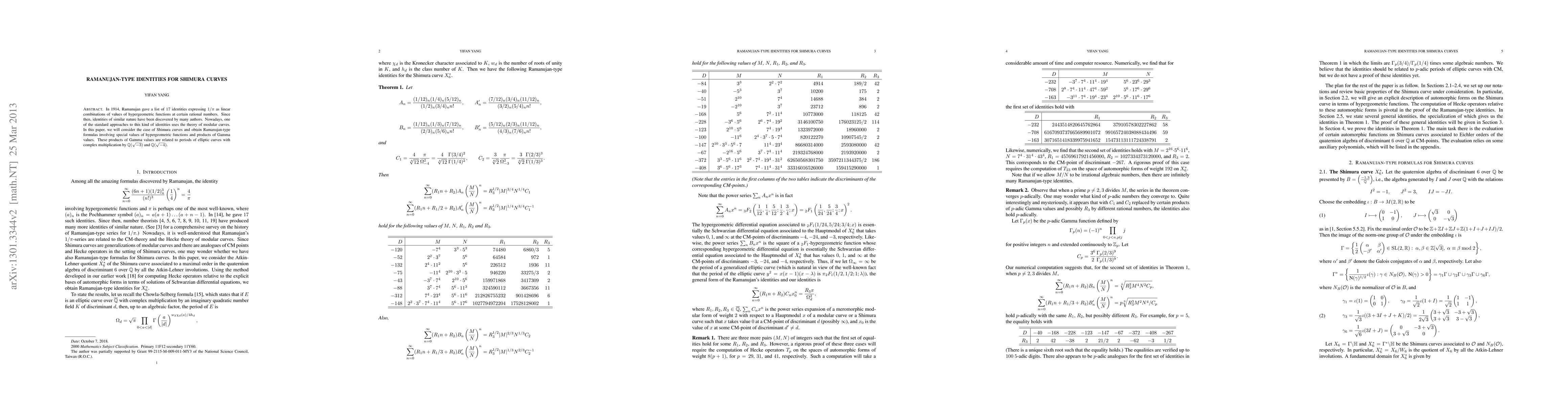 This paper develops Ramanujan-type identities for Shimura curves using modular curve theory, establishing formulas involving special hypergeometric function values and Gamma function products tied to elliptic curves with complex multiplication.