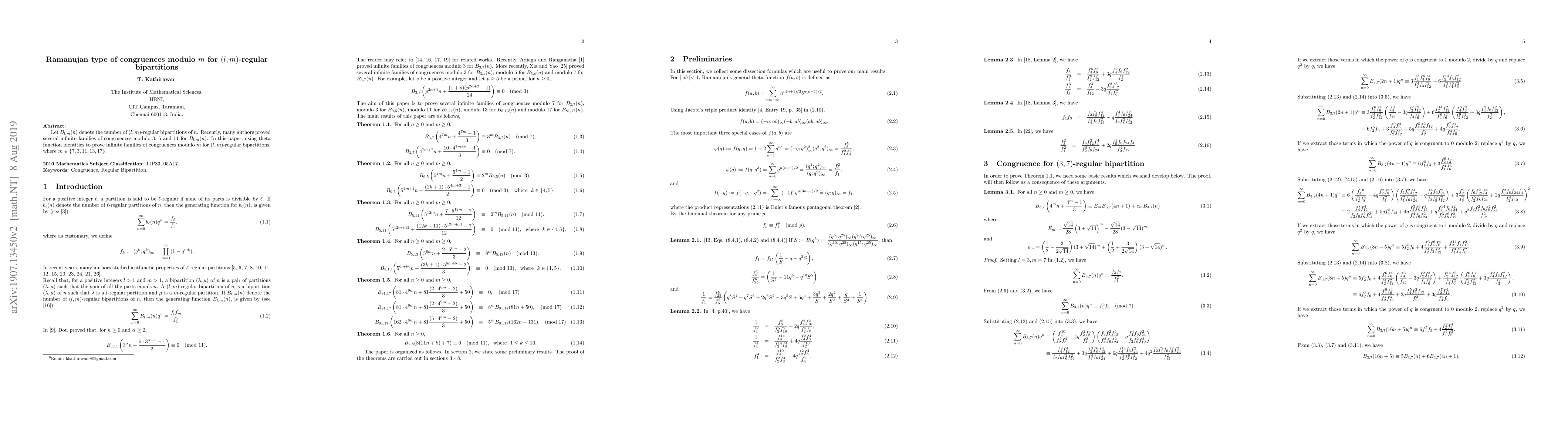 This paper explores infinite families of congruences modulo $7$, $3$, $11$, $13$, and $17$ for $(l,m)$-regular bipartitions, extending recent findings on congruences modulo $3$, $5$, and $11$. The proofs leverage identities from theta functions.