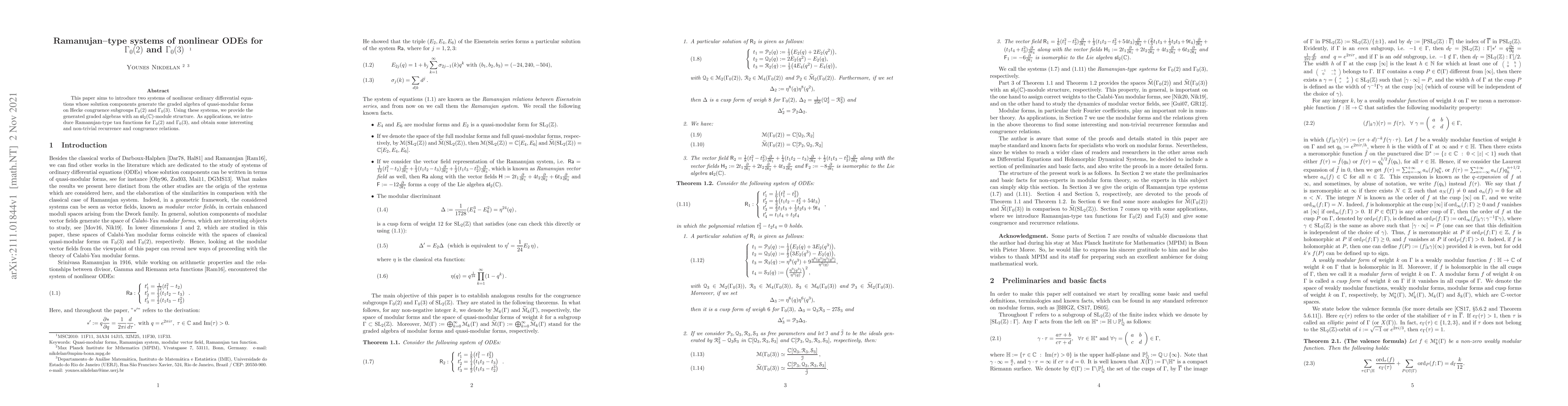 This paper aims to introduce two systems of nonlinear ordinary differential equations whose solution components generate the graded algebra of quasi-modular forms on Hecke congruence subgroups $\Gamma_0(2)$ and $\Gamma_0(3)$. Using these systems, we provide the generated graded algebras with an $\mathfrak{sl}_2(\mathbb{C})$-module structure. As applications, we introduce Ramanujan-type tau functions for $\Gamma_0(2)$ and $\Gamma_0(3)$, and obtain some interesting and non-trivial recurrence and congruence relations.