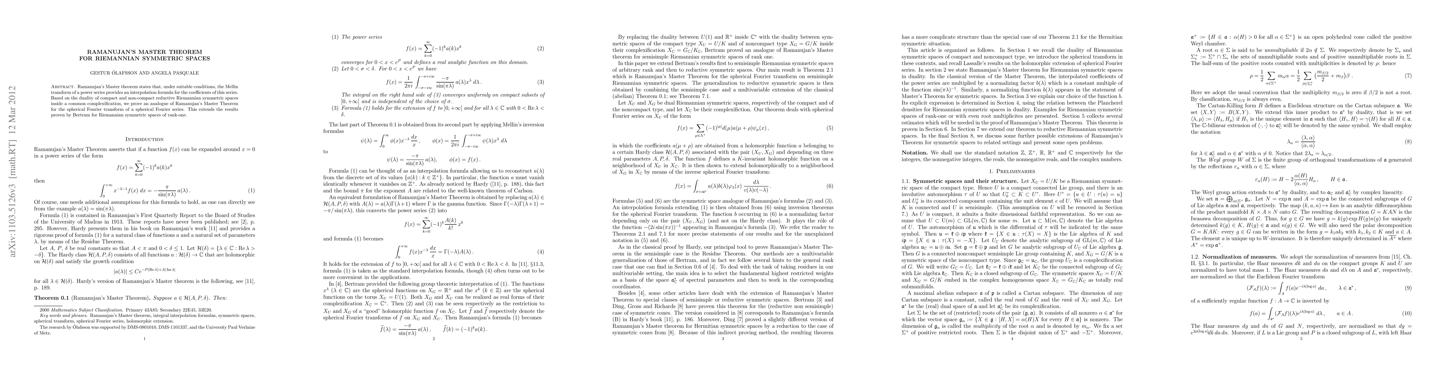Ramanujan's Master theorem is extended to Riemannian symmetric spaces through the spherical Fourier transform, providing an interpolation formula analogous to the original theorem. This generalization builds on the duality between compact and noncompact Riemannian symmetric spaces and extends previous results for rank-one spaces.