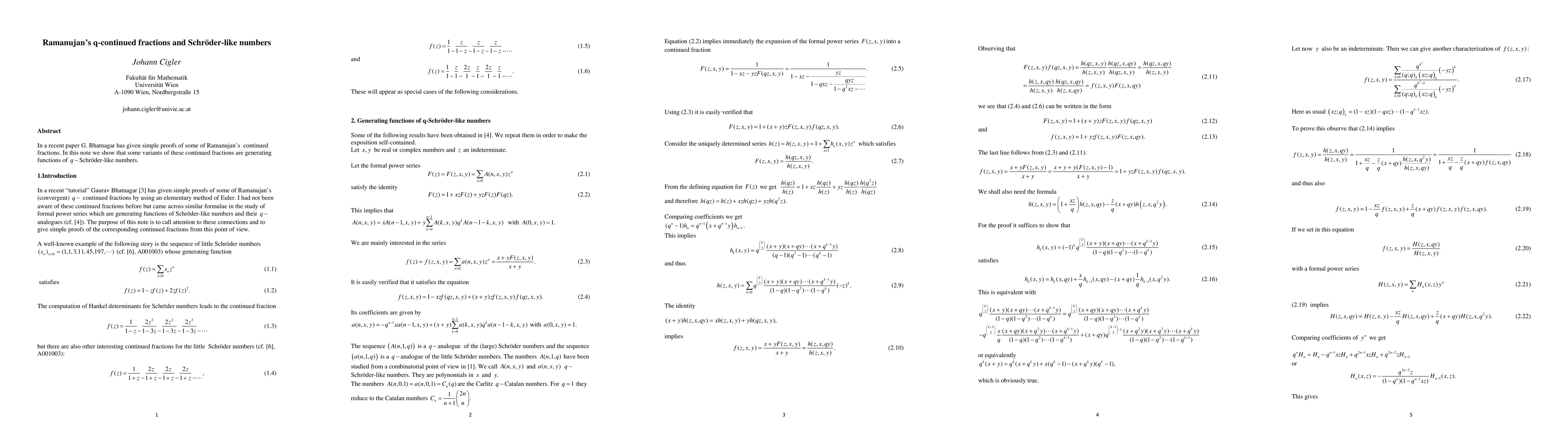 Summary: This paper provides simple proofs of Ramanujan's continued fractions and demonstrates that certain variants of these fractions serve as generating functions for q-Schroeder-like numbers.