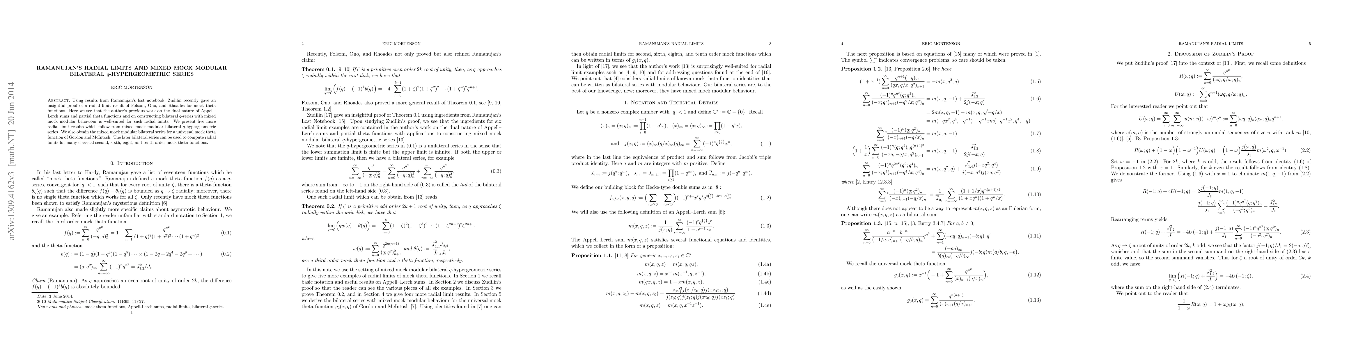 Summary: The paper extends Zudilin's proof of radial limit results for mock theta functions using Ramanujan's lost notebook insights. It introduces five new radial limit results derived from mixed mock modular bilateral $q$-hypergeometric series and computes a universal mixed mock modular bilateral series for classical second, sixth, eighth, and tenth order mock theta functions.