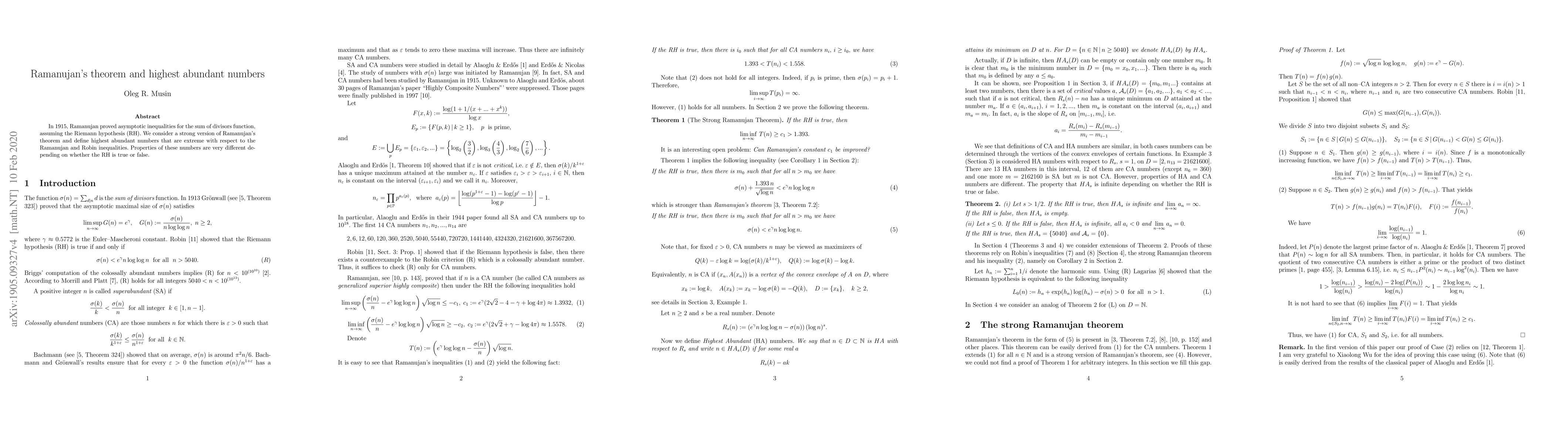 Ramanujan's theorem provides asymptotic inequalities for the sum of divisors function, contingent on the Riemann hypothesis. This paper explores a robust version of Ramanujan's theorem and identifies highest abundant numbers, whose properties vary significantly based on the truth of the Riemann hypothesis.