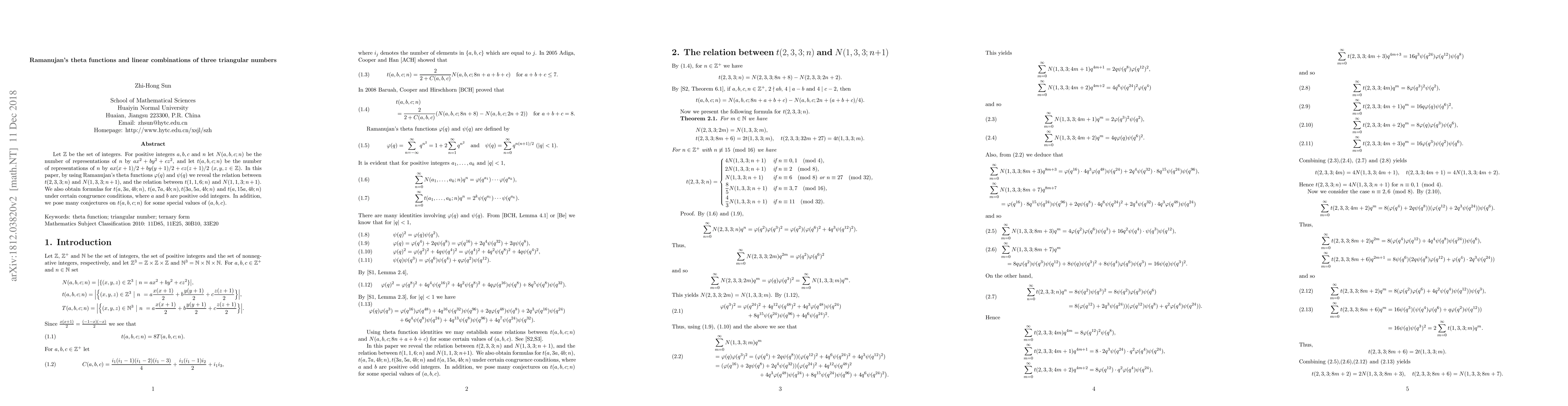 Let $\Bbb Z$ be the set of integers. For positive integers $a,b,c$ and $n$ let $N(a,b,c;n)$ be the number of representations of $n$ by $ax^2+by^2+cz^2$, and let $t(a,b,c;n)$ be the number of representations of $n$ by $ax(x+1)/2+by(y+1)/2+cz(z+1)/2$ $(x,y,z\in\Bbb Z)$. In this paper, by using Ramanujan's theta functions $\varphi(q)$ and $\psi(q)$ we reveal the relation between $t(2,3,3;n)$ and $N(1,3,3;n+1)$, and the relation between $t(1,1,6;n)$ and $N(1,1,3;n+1)$. We also obtain formulas for $t(a,3a,4b;n),$ $t(a,7a,4b;n),t(3a,5a,4b;n)$ and $t(a,15a,4b;n)$ under certain congruence conditions, where $a$ and $b$ are positive odd integers. In addition, we pose many conjectures on $t(a,b,c;n)$ for some special values of $(a,b,c)$.