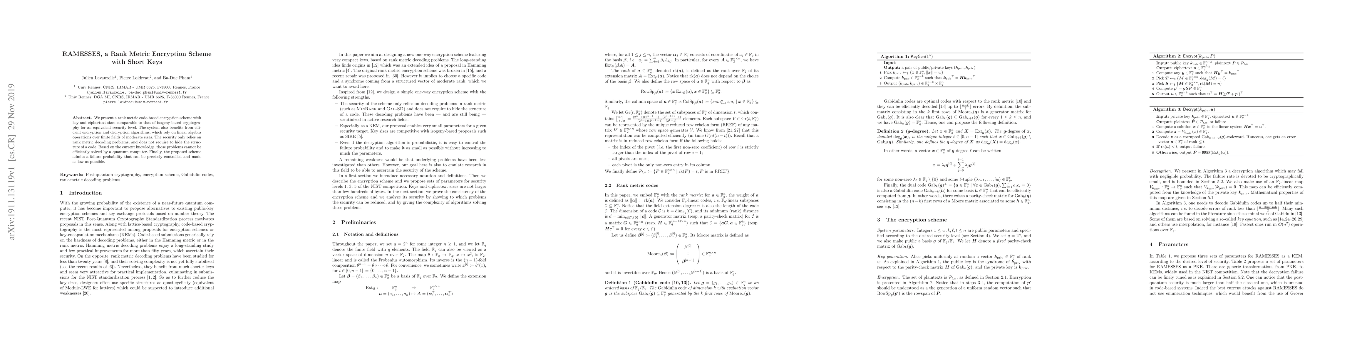 RAMESSES is a rank metric code-based encryption scheme with short keys comparable to isogeny-based cryptography, offering efficient encryption and decryption through linear algebra. Its security is based on rank metric decoding problems, which are believed to be quantum-resistant, and allows precise control over failure probability.