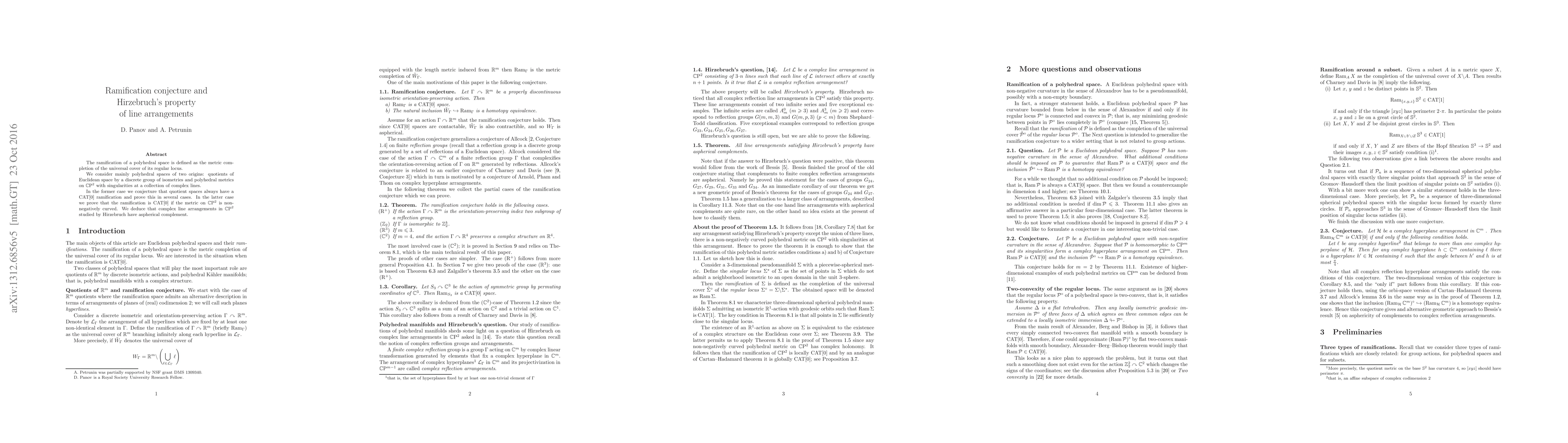 The ramification of a polyhedral space is defined as the metric completion of the universal cover of its regular locus. We consider mainly polyhedral spaces of two origins: quotients of Euclidean space by a discrete group of isometries and polyhedral metrics on the complex projective plane with singularities at a collection of complex lines. In the former case we conjecture that quotient spaces always have a CAT[0] ramification and prove this in several cases. In the latter case we prove that the ramification is CAT[0] if the metric is non-negatively curved. We deduce that complex line arrangements in the complex projective plane studied by Hirzebruch have aspherical complement.