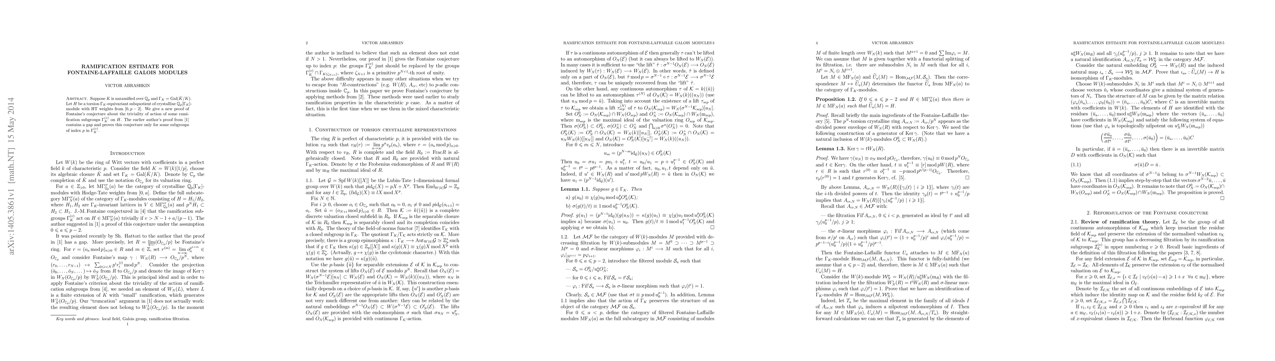 Suppose $K$ is unramified over $\mathbb Q _p$ and $\Gamma _K=\operatorname{Gal}(\bar K/K)$. Let $H$ be a torsion $\Gamma _K$-equivariant subquotient of crystalline $\mathbb Q _p[\Gamma _K]$-module with HT weights from $[0,p-2]$. We give a new proof of Fontaine's conjecture about the triviality of action of some ramification subgroups $\Gamma _K^{(v)}$ on $H$. The earlier author's proof from [1] contains a gap and proves this conjecture only for some subgroups of index $p$ in $\Gamma _K^{(v)}$.