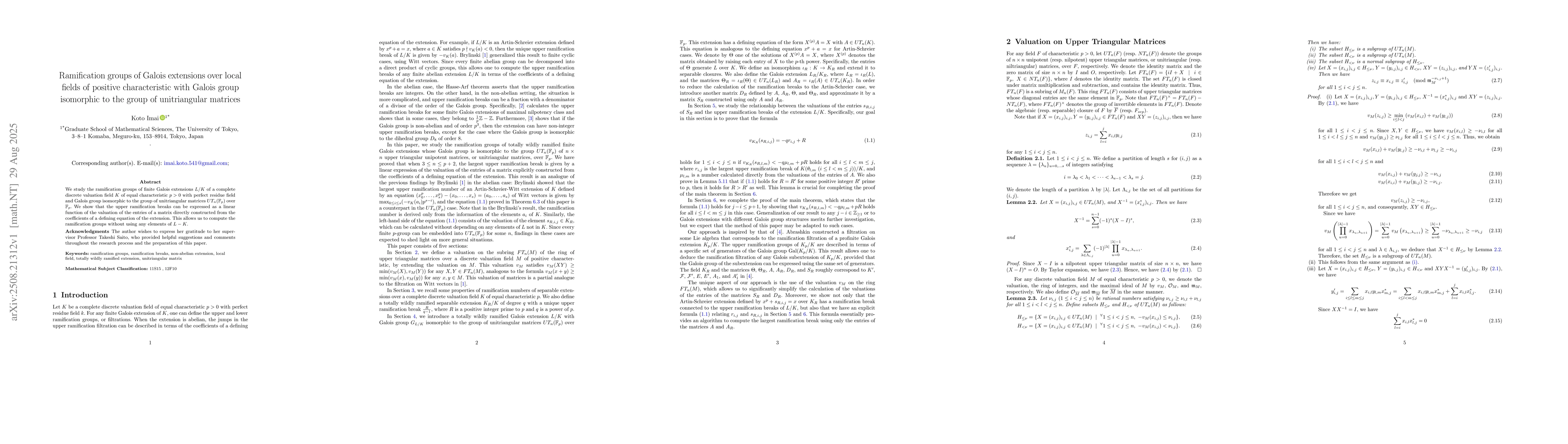 We study the ramification groups of finite Galois extensions $L/K$ of a complete discrete valuation field $K$ of equal characteristic $p>0$ with perfect residue field and Galois group isomorphic to the group of unitriangular matrices $UT_n(\mathbb{F}_p)$ over $\mathbb{F}_p$. We show that the upper ramification breaks can be expressed as a linear function of the valuation of the entries of a matrix directly constructed from the coefficients of a defining equation of the extension. This allows us to compute the ramification groups without using any elements of $L-K$.