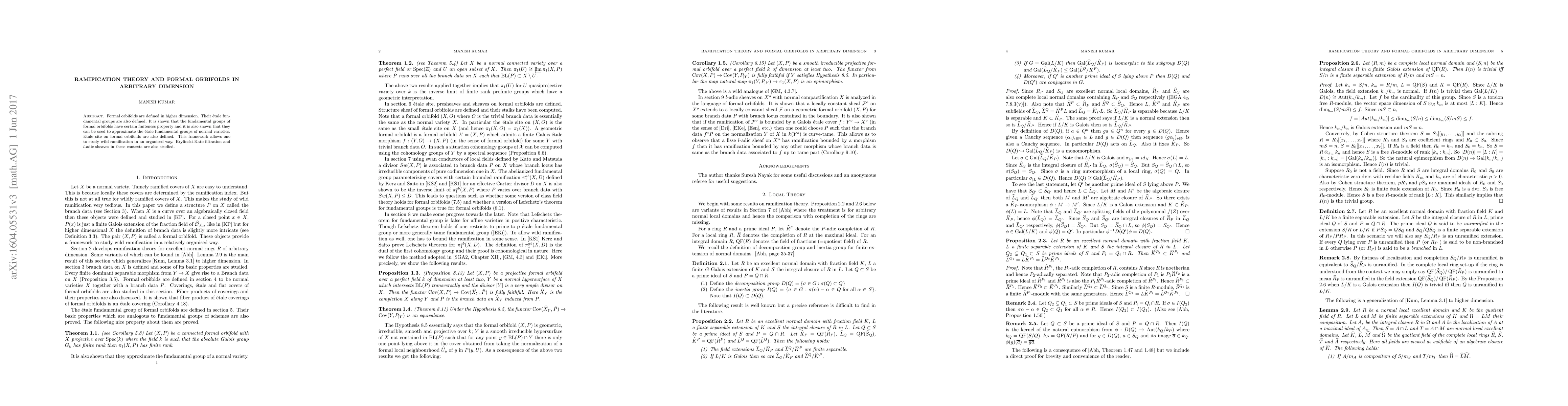 Formal orbifolds are defined in higher dimension. Their \'etale fundamental groups are also defined. It is shown that the fundamental groups of formal orbifolds have certain finiteness property and it is also shown that they can be used to approximate the \'etale fundamental groups of normal varieties. Etale site on formal orbifolds are also defined. This framework allows one to study wild ramification in an organised way. Brylinski-Kato filtration, Lefschetz theorem for fundamental groups and $l$-adic sheaves in these contexts are also studied.
