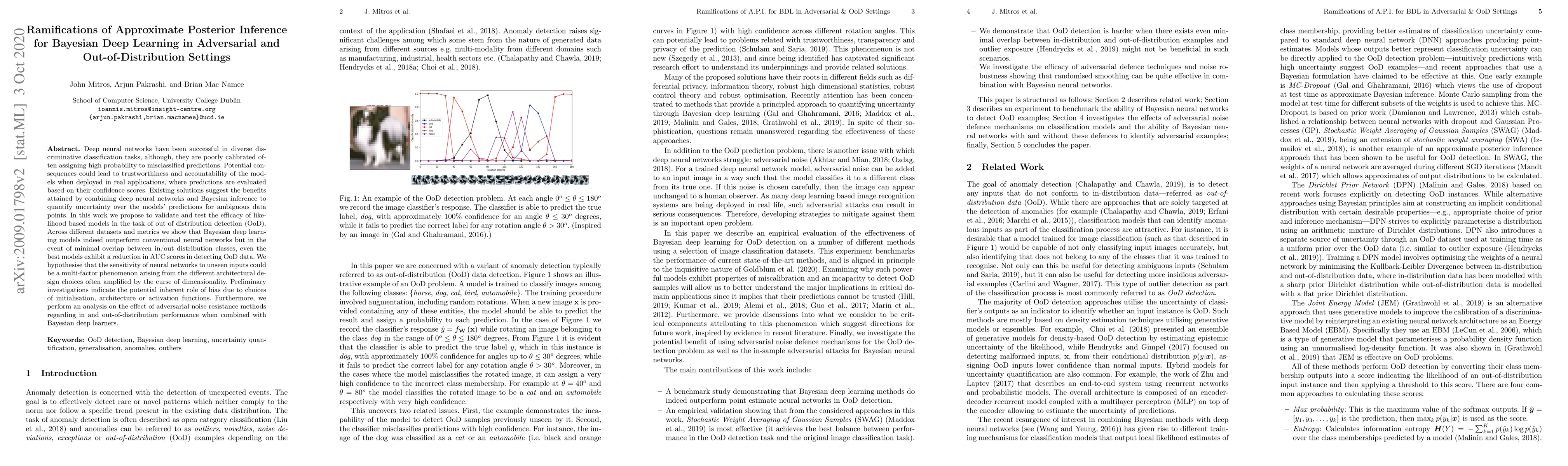 Deep neural networks have been successful in diverse discriminative classification tasks, although, they are poorly calibrated often assigning high probability to misclassified predictions. Potential consequences could lead to trustworthiness and accountability of the models when deployed in real applications, where predictions are evaluated based on their confidence scores. Existing solutions suggest the benefits attained by combining deep neural networks and Bayesian inference to quantify uncertainty over the models' predictions for ambiguous datapoints. In this work we propose to validate and test the efficacy of likelihood based models in the task of out of distribution detection (OoD). Across different datasets and metrics we show that Bayesian deep learning models on certain occasions marginally outperform conventional neural networks and in the event of minimal overlap between in/out distribution classes, even the best models exhibit a reduction in AUC scores in detecting OoD data. Preliminary investigations indicate the potential inherent role of bias due to choices of initialisation, architecture or activation functions. We hypothesise that the sensitivity of neural networks to unseen inputs could be a multi-factor phenomenon arising from the different architectural design choices often amplified by the curse of dimensionality. Furthermore, we perform a study to find the effect of the adversarial noise resistance methods on in and out-of-distribution performance, as well as, also investigate adversarial noise robustness of Bayesian deep learners.
