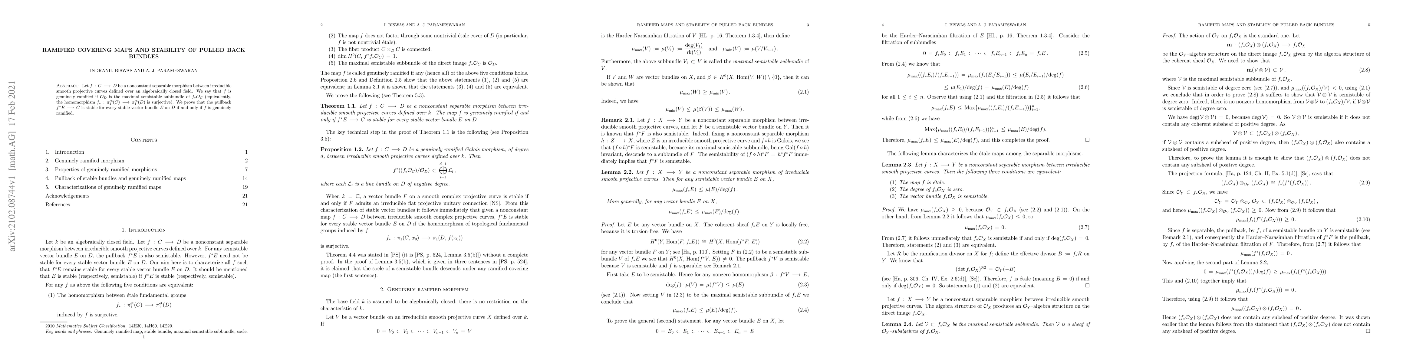 The paper shows that a nonconstant separable morphism between irreducible smooth projective curves is stable if and only if it is genuinely ramified, meaning the maximal semistable subbundle of its pullback is the entire sheaf.
