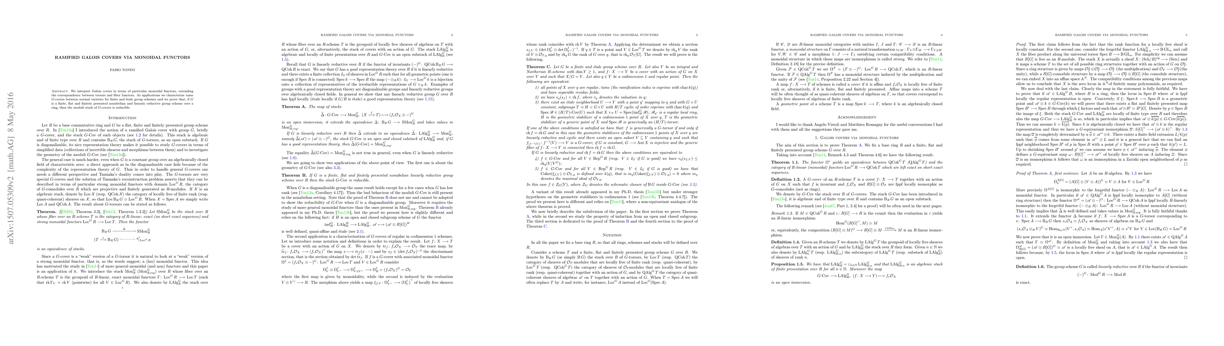 We interpret Galois covers in terms of particular monoidal functors, extending the correspondence between torsors and fiber functors. As applications we characterize tame $G$-covers between normal varieties for finite and \'etale group schemes and we prove that, if $G$ is a finite, flat and finitely presented nonabelian and linearly reductive group scheme over a ring, then the moduli stack of $G$-covers is reducible.