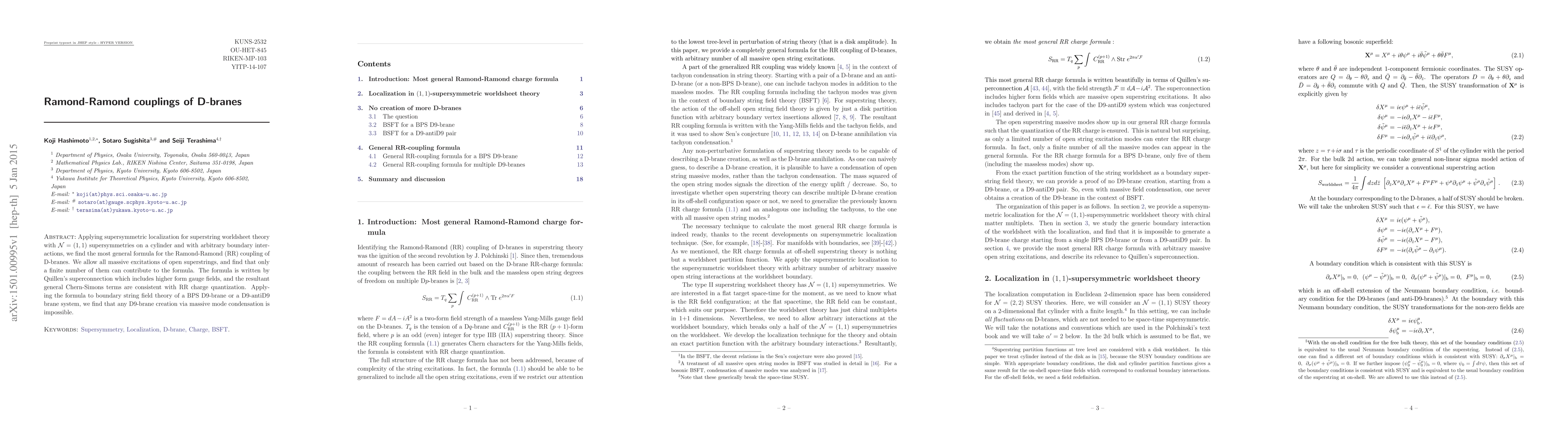 This research develops a comprehensive formula for Ramond-Ramond (RR) couplings of D-branes using supersymmetric localization, showing only a finite number of massive open string excitations contribute. The derived formula, expressed via Quillen's superconnection, supports RR charge quantization and reveals that D9-brane creation through massive mode condensation is impossible.