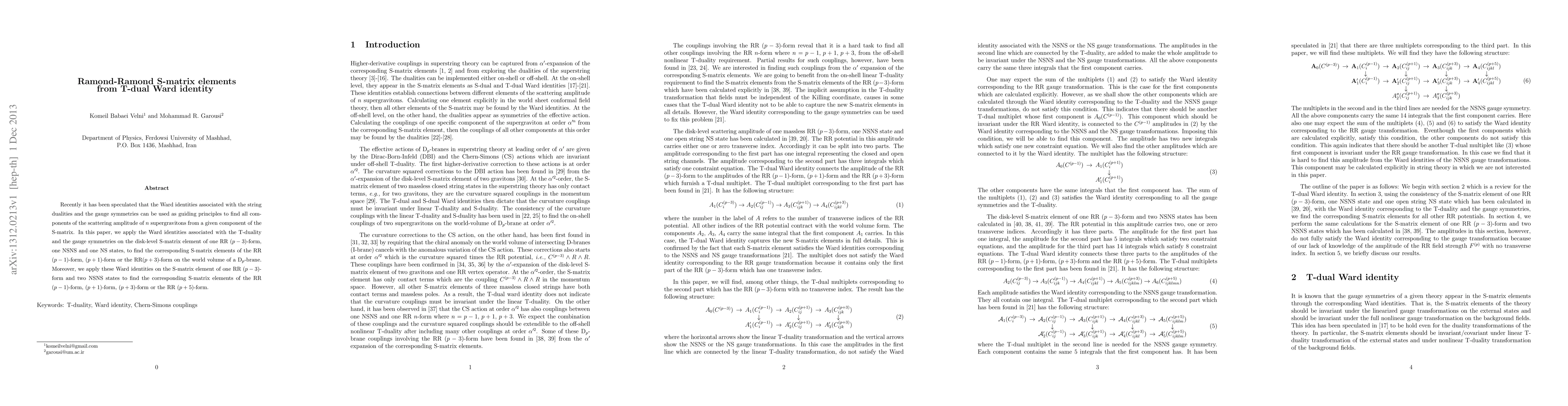 This paper utilizes T-duality and gauge symmetry Ward identities to derive S-matrix elements for Ramond-Ramond (RR) forms on D$_p$-branes, specifically for interactions involving RR $(p-3)$-form, NSNS, and NS states. The method extends to finding RR $(p-1)$-form, $(p+1)$-form, and higher forms through these dualities.