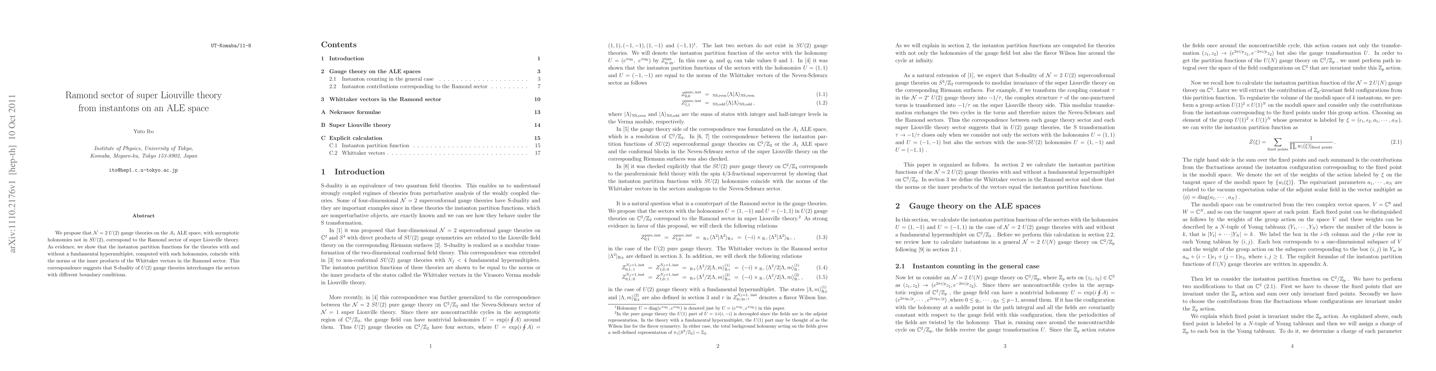 This paper proposes a correspondence between N=2 U(2) gauge theories on A_1 ALE space and the Ramond sector of super Liouville theory, evidenced by matching instanton partition functions with Whittaker vectors. It suggests S-duality interchanges sectors with different boundary conditions.
