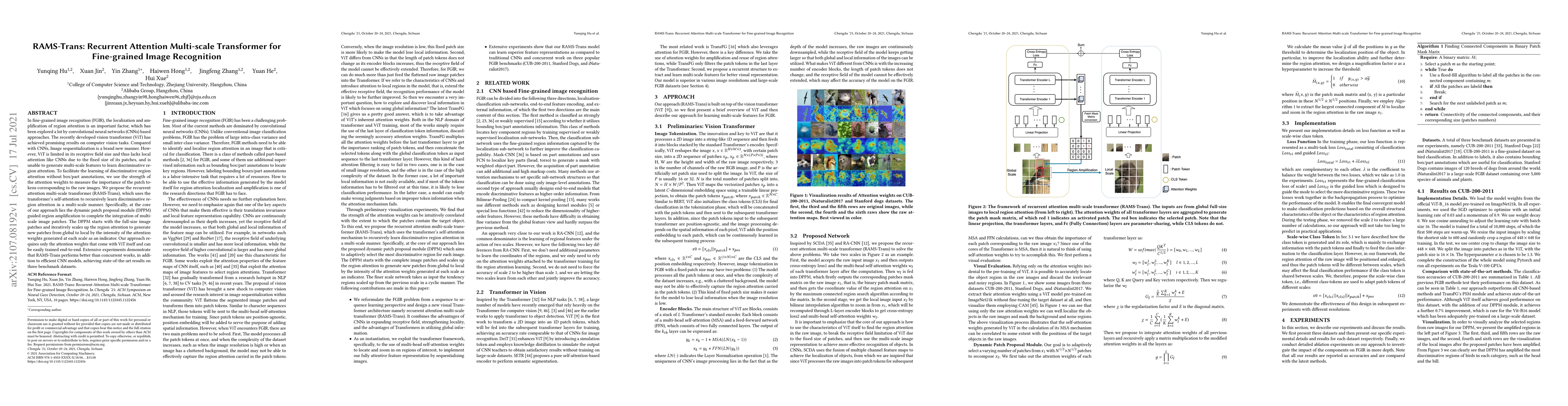The paper proposes RAMS-Trans, a Recurrent Attention Multi-scale Transformer for fine-grained image recognition, addressing limitations of Vision Transformers (ViT) by leveraging self-attention to learn discriminative region attention across multiple scales without requiring box/part annotations. The Dynamic Patch Proposal Module (DPPM) dynamically generates patches based on attention weights, achieving state-of-the-art results on benchmark datasets.