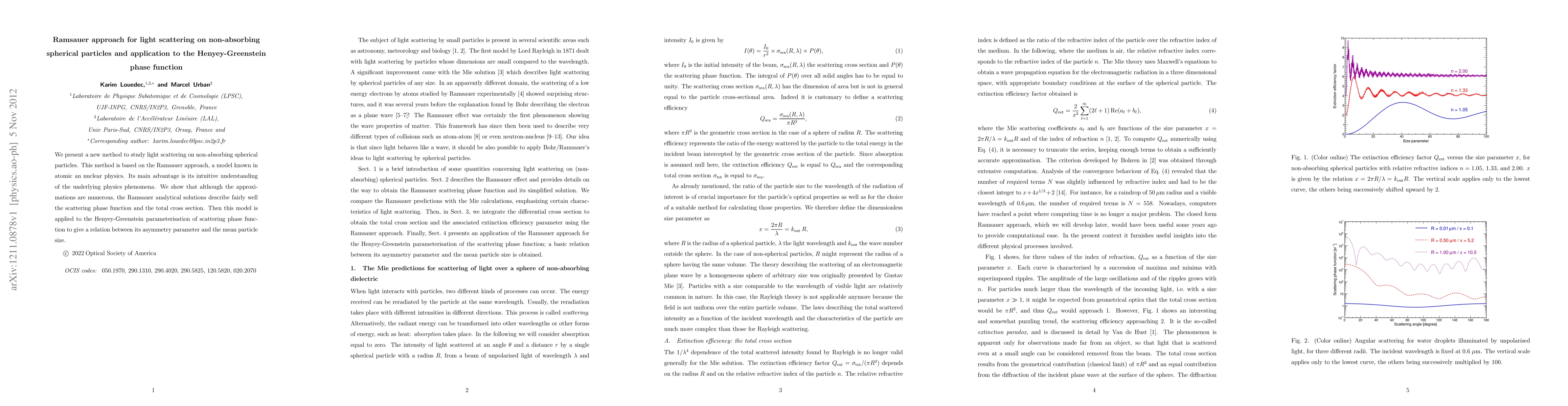 Summary: This paper introduces a Ramsauer approach for analyzing light scattering on non-absorbing spherical particles, demonstrating its effectiveness through analytical solutions. It also establishes a connection between the Henyey-Greenstein phase function's asymmetry parameter and the mean particle size using this method.