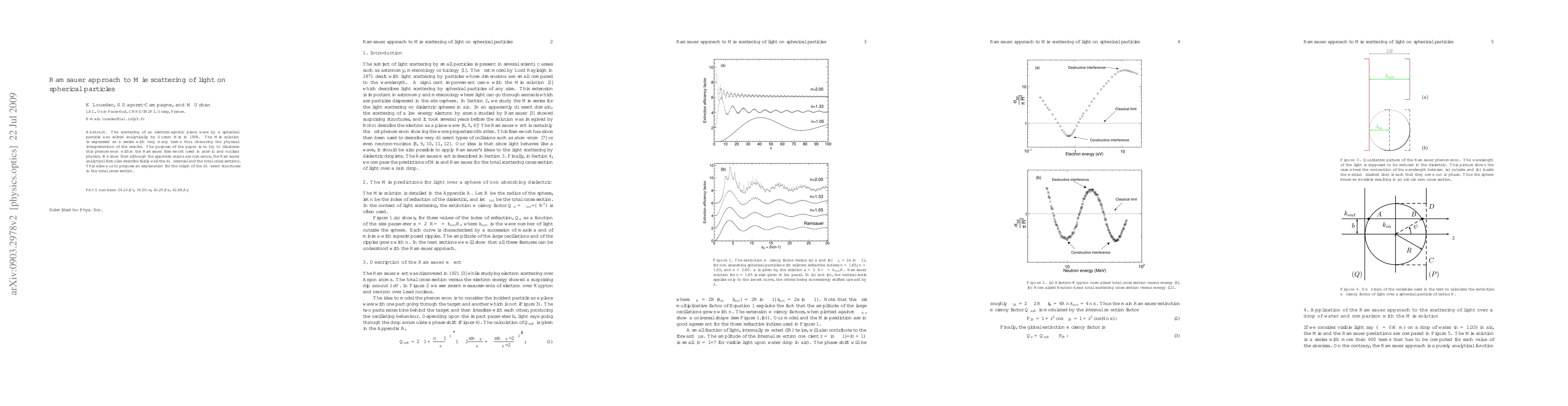 The scattering of an electromagnetic plane wave by a spherical particle was solved analytically by Gustav Mie in 1908. The Mie solution is expressed as a series with very many terms thus obscuring the physical interpretations of the results. The purpose of the paper is to try to illustrate this phenomenon within the Ramsauer framework used in atomic and nuclear physics. We show that although the approximations are numerous, the Ramsauer analytical formulae describe fairly well the differential and the total cross sections. This allows us to propose an explanation for the origin of the different structures in the total cross section.