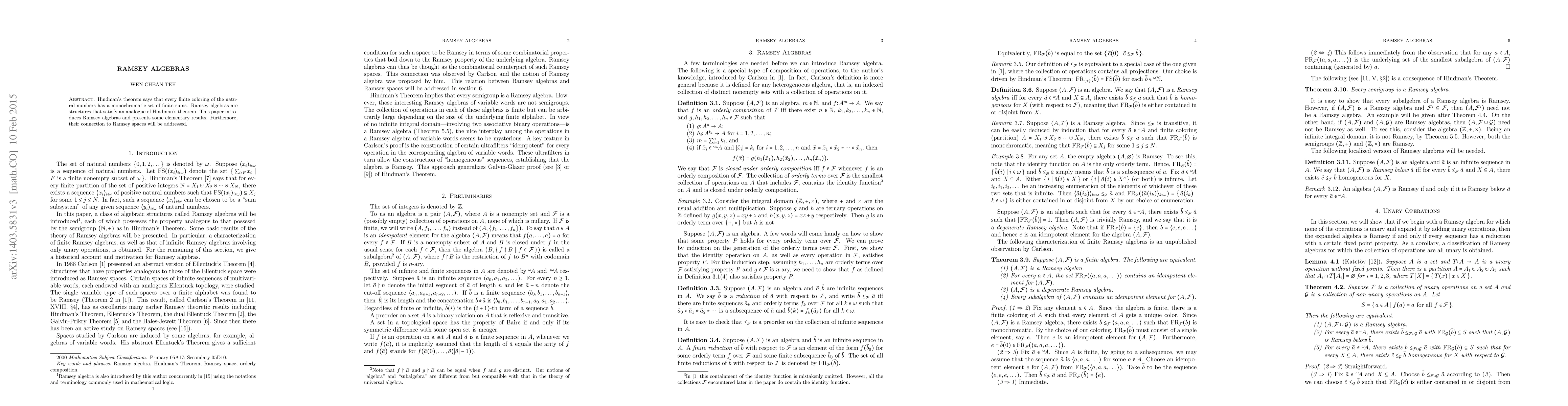 This paper introduces Ramsey algebras, structures analogous to Hindman's theorem, and presents basic results. It also explores their connection to Ramsey spaces.