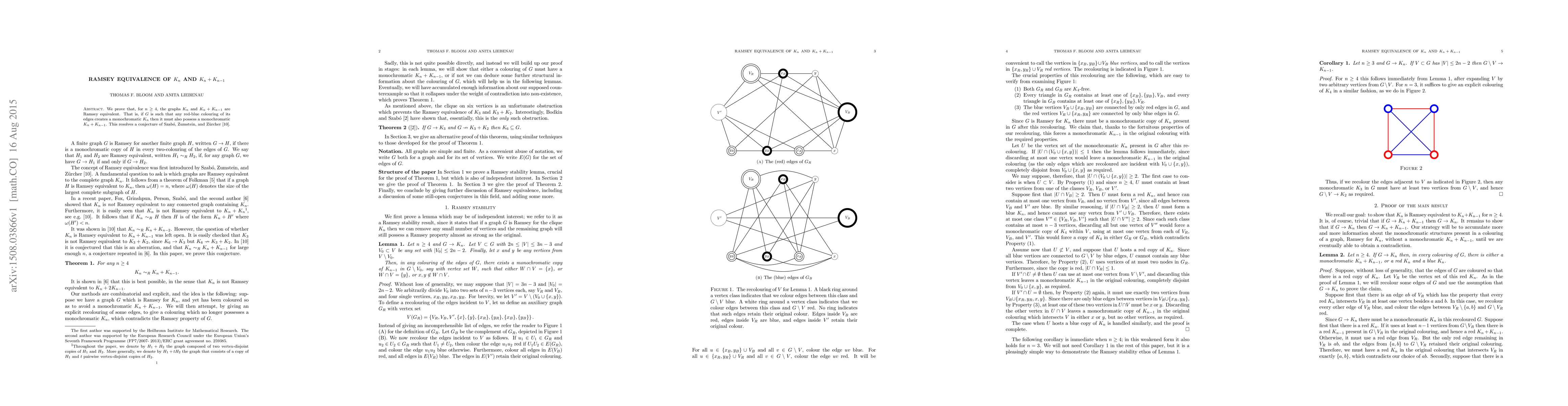 The paper uses proof techniques, including Lemmas and Corollaries, to demonstrate Ramsey equivalence between $K_n$ and $K_n + K_{n-1}$ for $n \geq 4$.