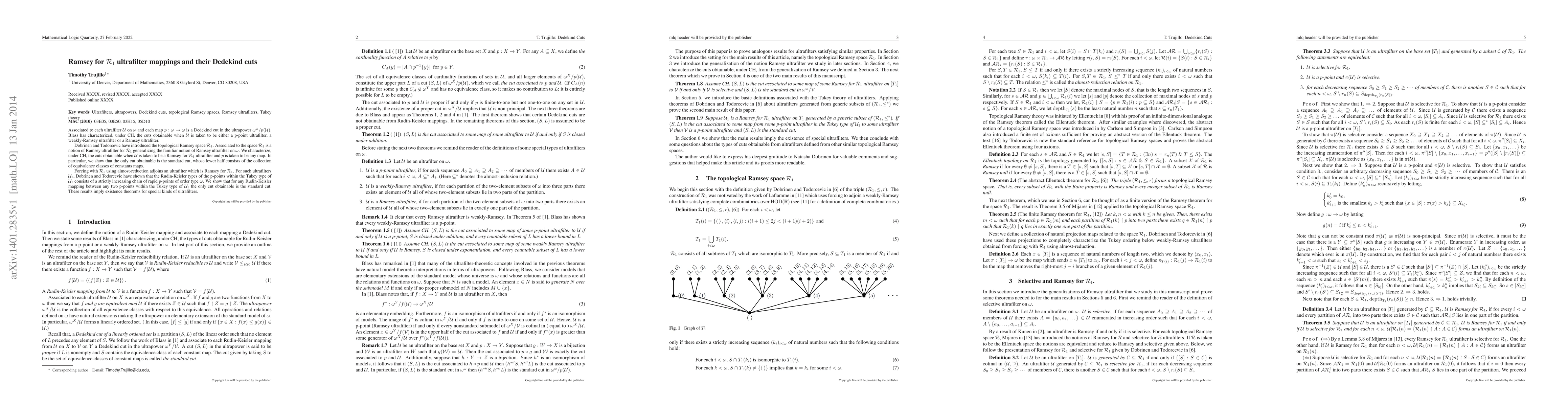 Associated to each ultrafilter $\mathcal{U}$ on $\omega$ and each map $p:\omega\rightarrow \omega$ is a Dedekind cut in the ultrapower $\omega^{\omega}/p( \mathcal{U})$. Blass has characterized, under CH, the cuts obtainable when $\mathcal{U}$ is taken to be either a p-point ultrafilter, a weakly-Ramsey ultrafilter or a Ramsey ultrafilter. Dobrinen and Todorcevic have introduced the topological Ramsey space $\mathcal{R}_{1}$. Associated to the space $\mathcal{R}_{1}$ is a notion of Ramsey ultrafilter for $\mathcal{R}_{1}$ generalizing the familiar notion of Ramsey ultrafilter on $\omega$. We characterize, under CH, the cuts obtainable when $\mathcal{U}$ is taken to be a Ramsey for $\mathcal{R}_{1}$ ultrafilter and $p$ is taken to be any map. In particular, we show that the only cut obtainable is the standard cut, whose lower half consists of the collection of equivalence classes of constants maps. Forcing with $\mathcal{R}_{1}$ using almost-reduction adjoins an ultrafilter which is Ramsey for $\mathcal{R}_{1}$. For such ultrafilters $\mathcal{U}_{1}$, Dobrinen and Todorcevic have shown that the Rudin-Keisler types of the p-points within the Tukey type of $\mathcal{U}_{1}$ consists of a strictly increasing chain of rapid p-points of order type $\omega$. We show that for any Rudin-Keisler mapping between any two p-points within the Tukey type of $\mathcal{U}_{1}$ the only cut obtainable is the standard cut. These results imply existence theorems for special kinds of ultrafilters.