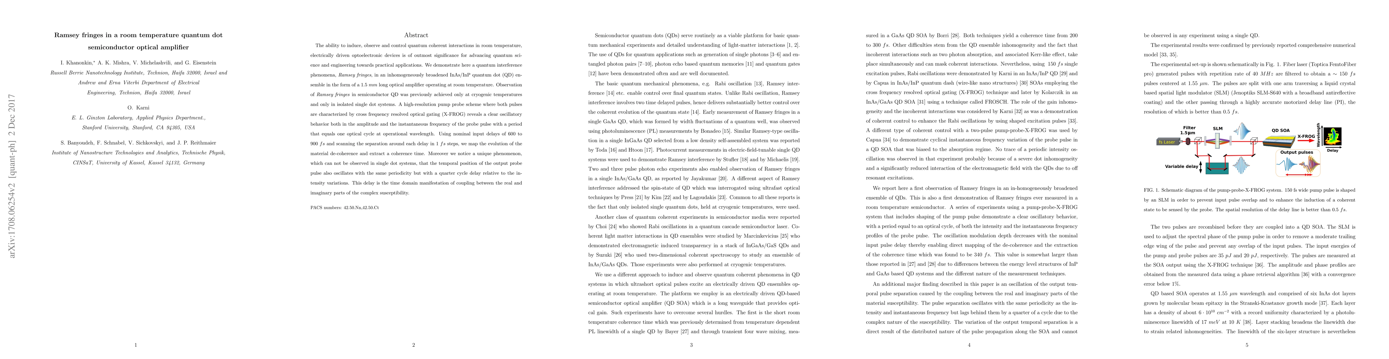This paper demonstrates the observation of Ramsey fringes in a room temperature quantum dot semiconductor optical amplifier, previously only achievable at cryogenic temperatures. The study reveals oscillatory behavior in both amplitude and frequency of the probe pulse, indicating quantum coherence and material decoherence dynamics.