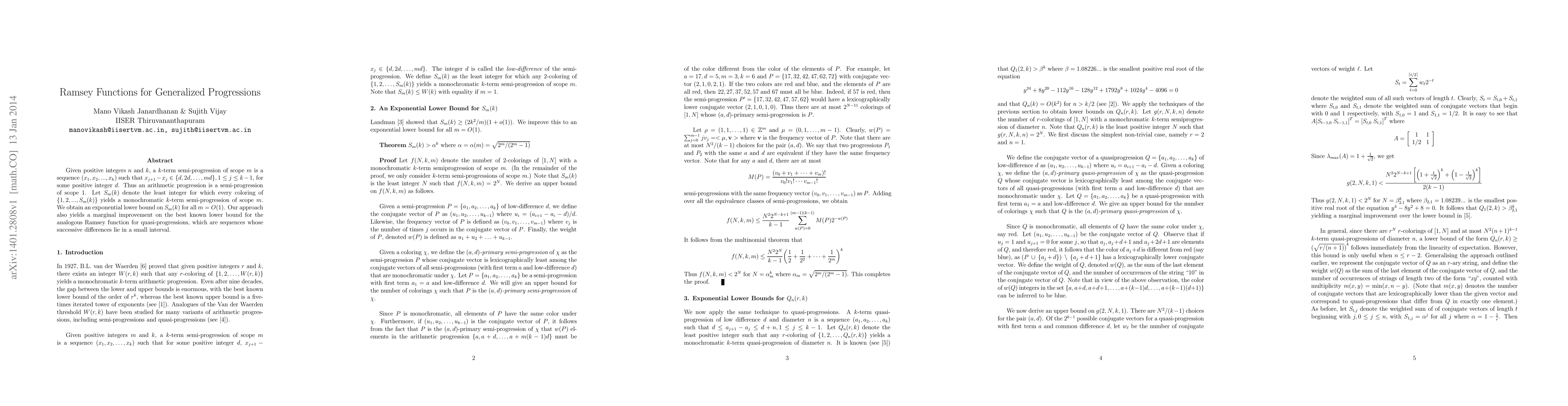 The research uses a combinatorial approach to analyze Ramsey functions for generalized progressions.