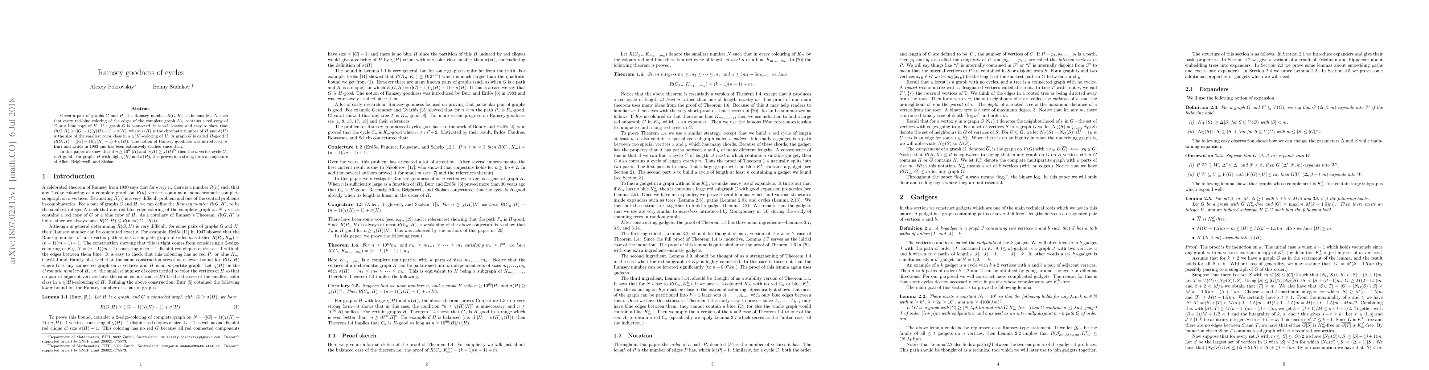 This paper demonstrates that for sufficiently large $n$ and specific conditions on $\sigma(H)$ and $\chi(H)$, the $n$-vertex cycle $C_n$ is $H$-good, confirming a conjecture regarding Ramsey goodness for cycles in relation to other graphs $H$. This result significantly extends the understanding of Ramsey numbers for cycles.