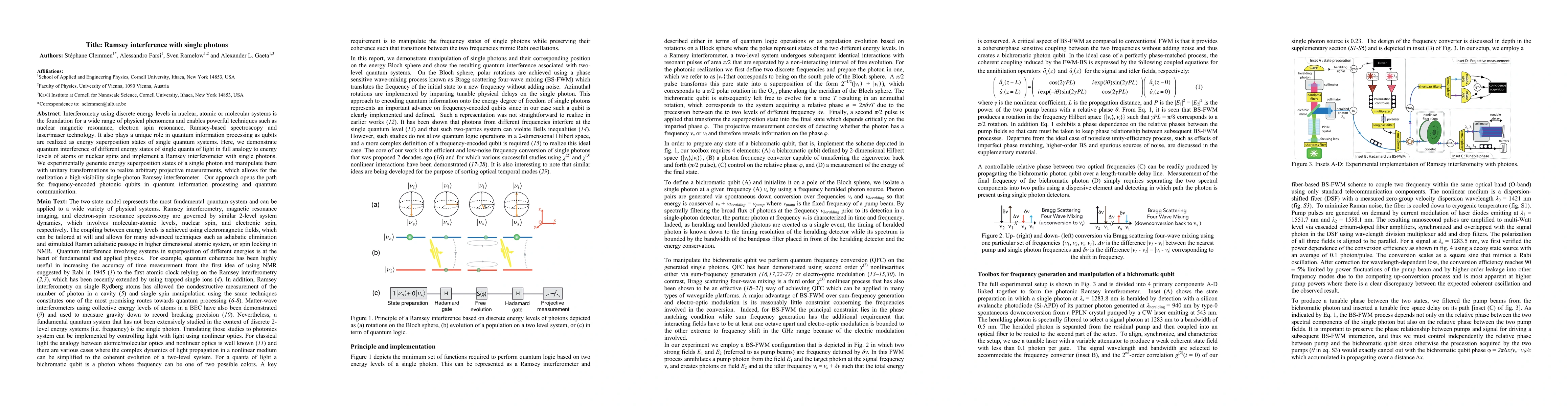 This paper demonstrates quantum interference using single photons analogous to atomic energy levels, implementing a Ramsey interferometer to manipulate energy superposition states. This approach paves the way for frequency-encoded photonic qubits in quantum information processing and communication.
