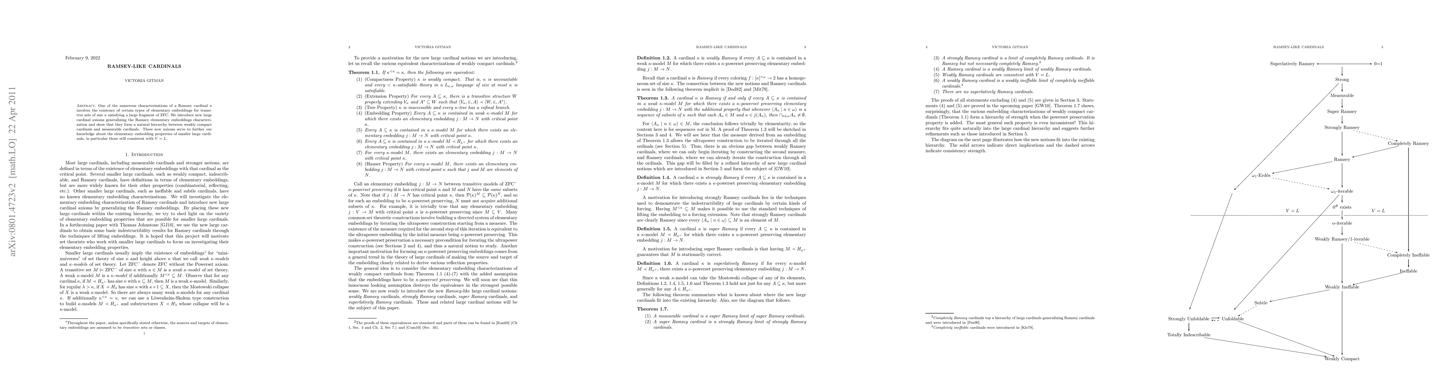 The paper introduces new large cardinal axioms generalizing the Ramsey elementary embeddings characterization and demonstrates that they form a natural hierarchy between weakly compact cardinals and measurable cardinals.