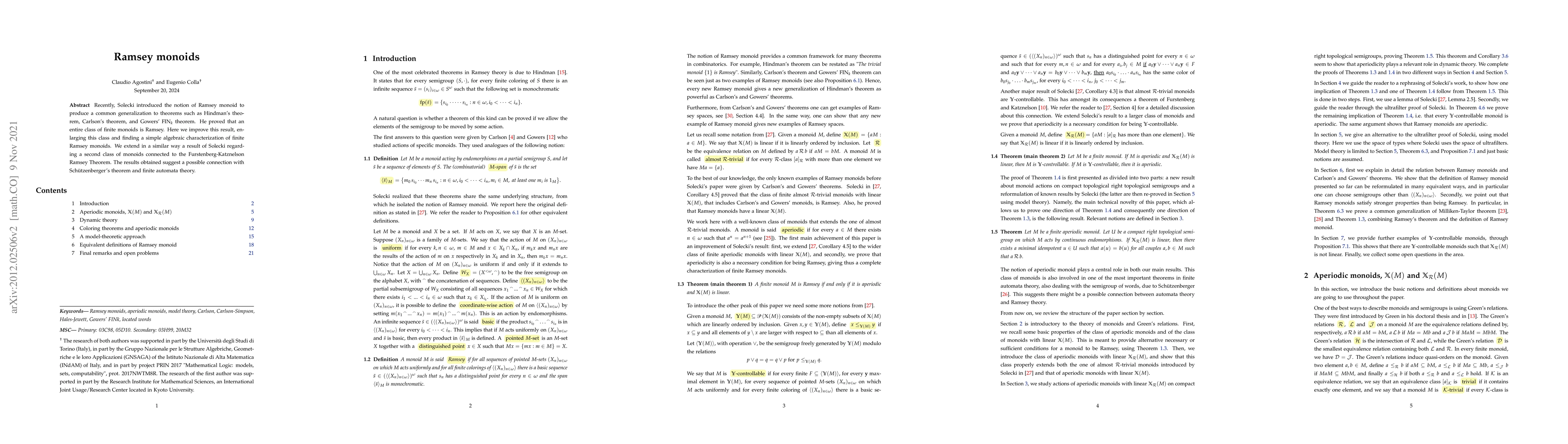 Researchers extend Solecki's definition of Ramsey monoids to improve upon earlier results, finding a simpler characterization for finite Ramsey monoids that also connects to other areas like Sch"utzenberger's theorem and finite automata theory.
