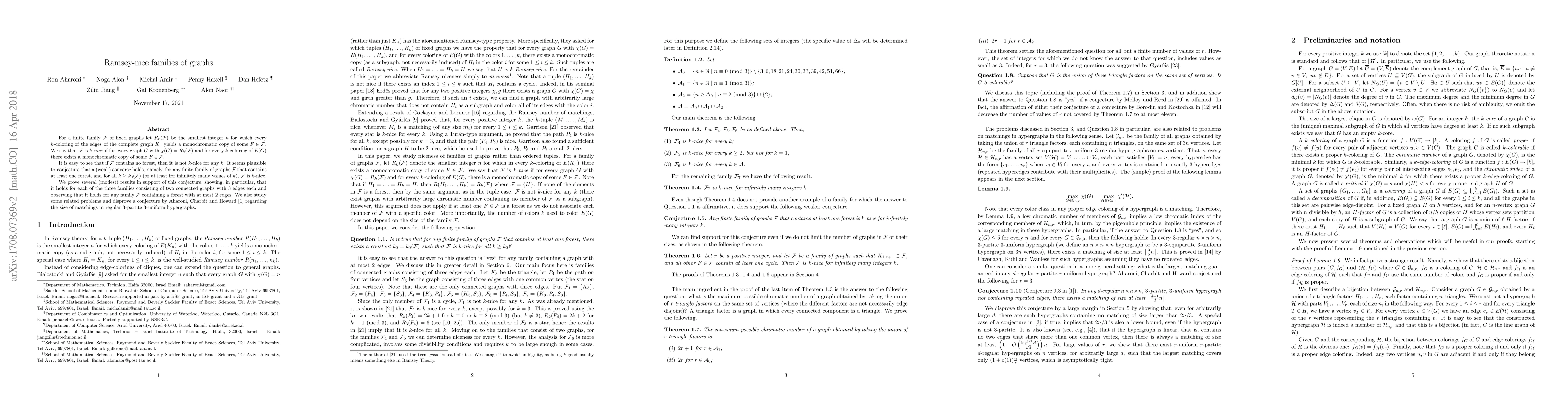 This paper explores the concept of 'k-nice' families of graphs, proving several results that support a conjecture about their existence for families containing at least one forest. The research also disproves a related conjecture about matchings in 3-uniform hypergraphs.