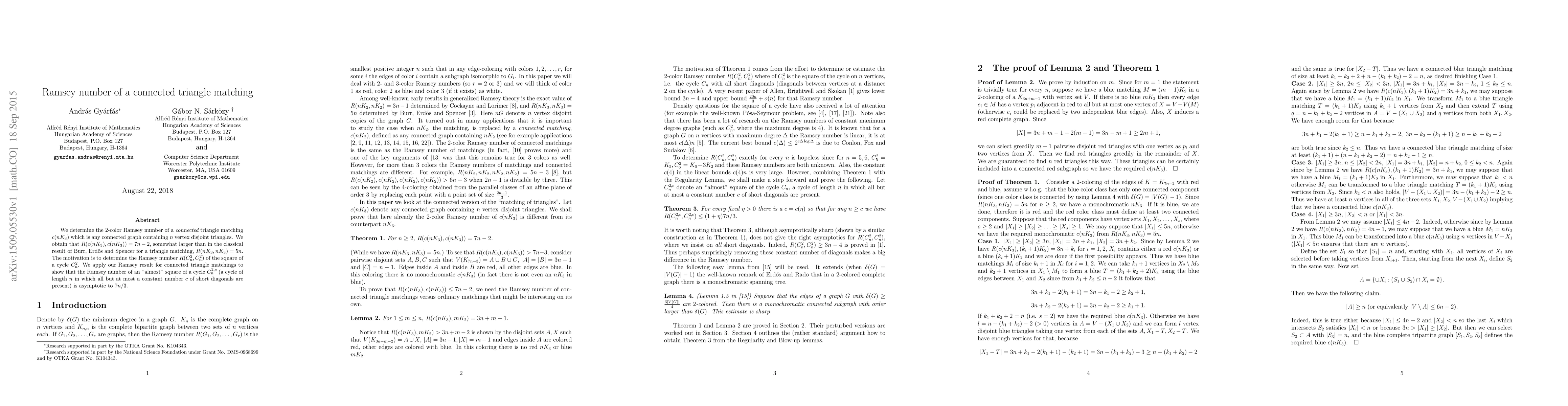 We determine the $2$-color Ramsey number of a {\em connected} triangle matching $c(nK_3)$ which is any connected graph containing $n$ vertex disjoint triangles. We obtain that $R(c(nK_3),c(nK_3))=7n-2$, somewhat larger than in the classical result of Burr, Erd\H os and Spencer for a triangle matching, $R(nK_3,nK_3)=5n$. The motivation is to determine the Ramsey number $R(C_n^2,C_n^2)$ of the square of a cycle $C_n^2$. We apply our Ramsey result for connected triangle matchings to show that the Ramsey number of an "almost" square of a cycle $C_n^{2,c}$ (a cycle of length $n$ in which all but at most a constant number $c$ of short diagonals are present) is asymptotic to $7n/3$.