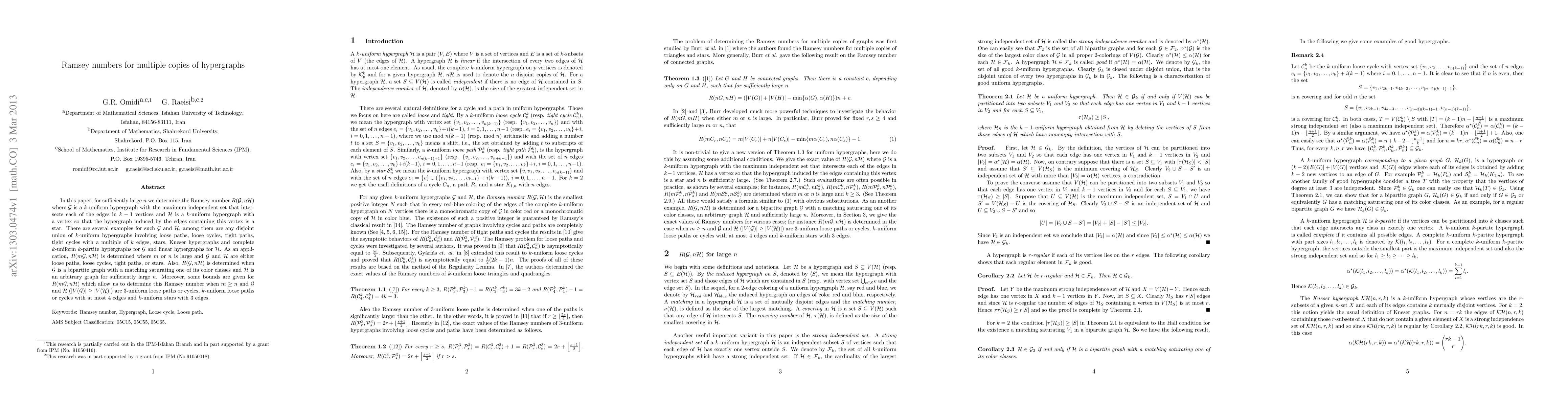 This paper determines the Ramsey number $R(G,nH)$ for specific $k$-uniform hypergraphs $G$ and $H$, where $G$ has a maximum independent set intersecting each edge in $k-1$ vertices and $H$ contains a star induced by its edges. Applications include determining $R(mG,nH)$ for large $m$ or $n$ and various combinations of $G$ and $H$, along with bounds for cases where $G$ and $H$ are specific hypergraphs.