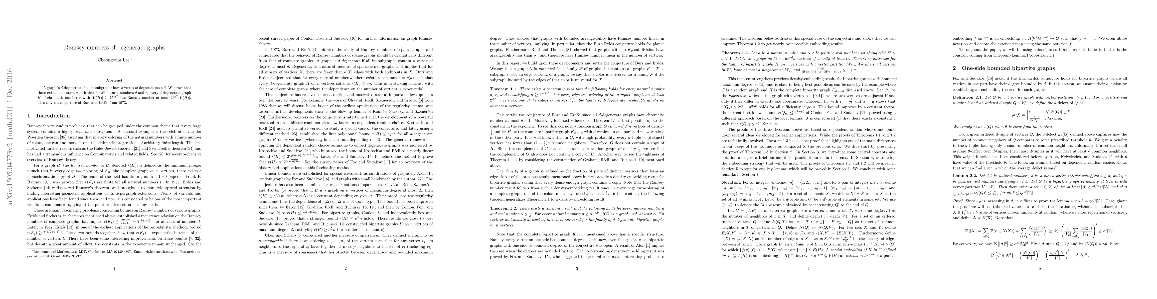 A graph is $d$-degenerate if all its subgraphs have a vertex of degree at most $d$. We prove that there exists a constant $c$ such that for all natural numbers $d$ and $r$, every $d$-degenerate graph $H$ of chromatic number $r$ with $|V(H)| \ge 2^{d^22^{cr}}$ has Ramsey number at most $2^{d2^{cr}} |V(H)|$. This solves a conjecture of Burr and Erd\H{o}s from 1973.