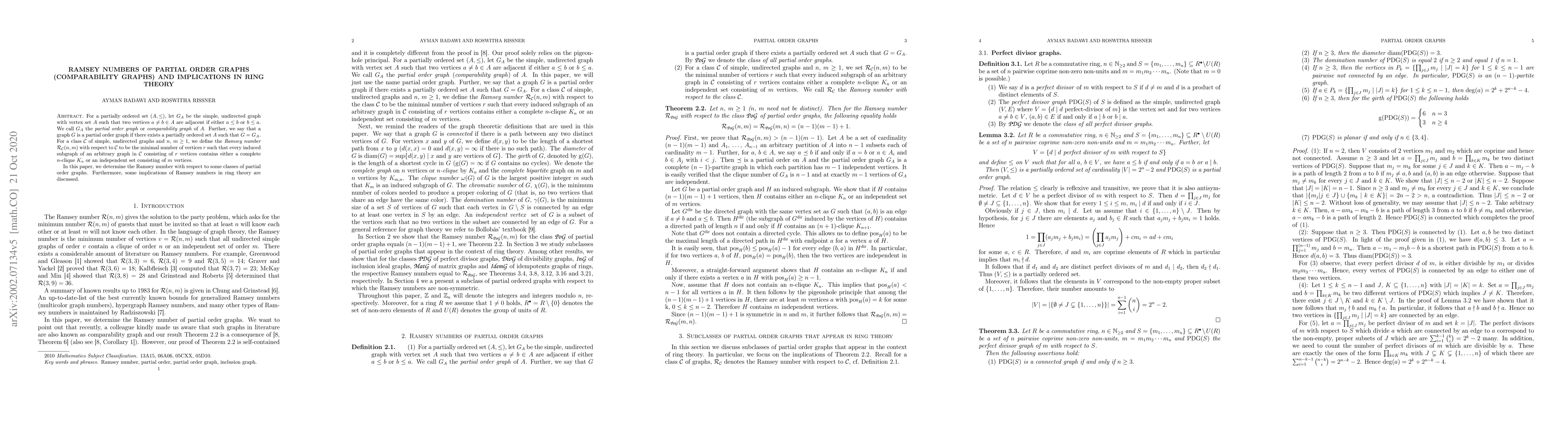 This paper investigates Ramsey numbers for partial order graphs (comparability graphs), determining the minimal vertex count ensuring specific subgraph configurations, and explores their implications in ring theory.