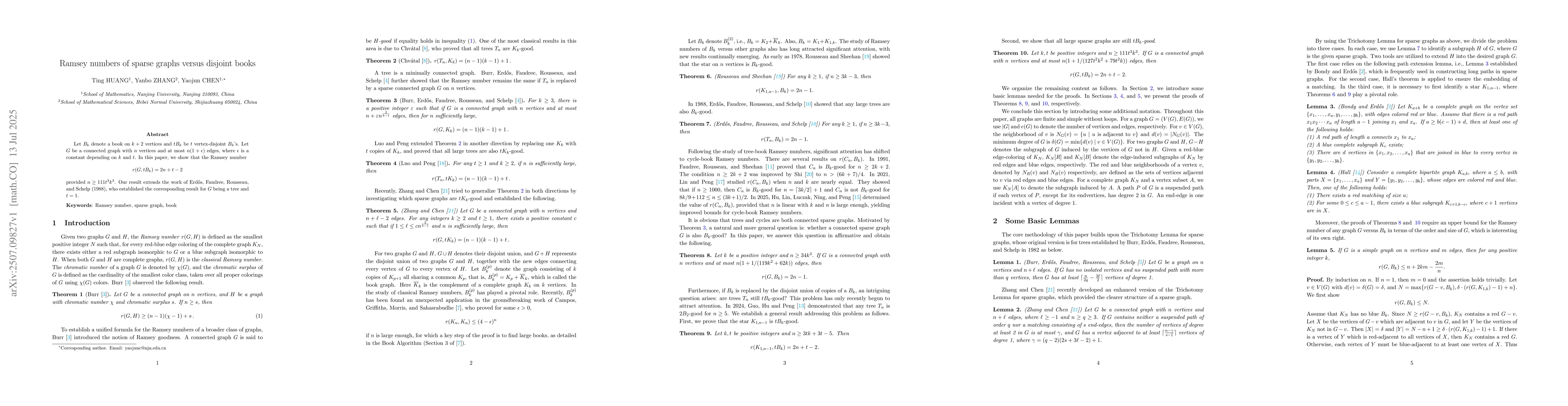 Let $B_k$ denote a book on $k+2$ vertices and $tB_k$ be $t$ vertex-disjoint $B_k$'s. Let $G$ be a connected graph with $n$ vertices and at most $n(1+\epsilon)$ edges, where $\epsilon$ is a constant depending on $k$ and $t$. In this paper, we show that the Ramsey number $$r(G,tB_k)=2n+t-2$$ provided $n\ge 111t^3k^3$. Our result extends the work of Erd\H{o}s, Faudree, Rousseau, and Schelp (1988), who established the corresponding result for $G$ being a tree and $t=1$.