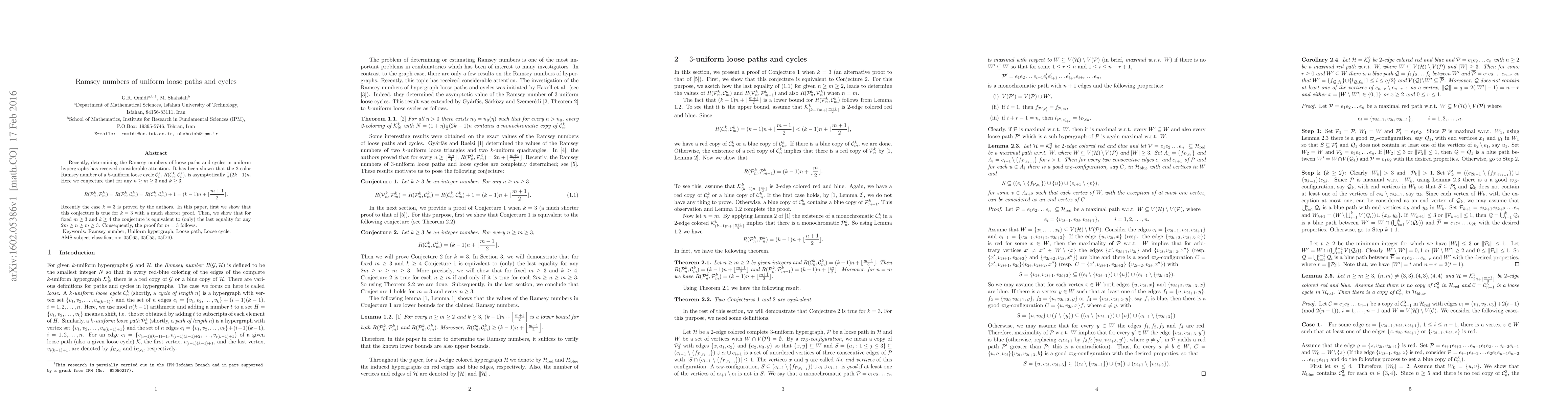 Recently, determining the Ramsey numbers of loose paths and cycles in uniform hypergraphs has received considerable attention. It has been shown that the $2$-color Ramsey number of a $k$-uniform loose cycle $\mathcal{C}^k_n$, $R(\mathcal{C}^k_n,\mathcal{C}^k_n)$, is asymptotically $\frac{1}{2}(2k-1)n$. Here we conjecture that for any $n\geq m\geq 3$ and $k\geq 3,$ $$R(\mathcal{P}^k_n,\mathcal{P}^k_m)=R(\mathcal{P}^k_n,\mathcal{C}^k_m)=R(\mathcal{C}^k_n,\mathcal{C}^k_m)+1=(k-1)n+\lfloor\frac{m+1}{2}\rfloor.$$ Recently the case $k=3$ is proved by the authors. In this paper, first we show that this conjecture is true for $k=3$ with a much shorter proof. Then, we show that for fixed $m\geq 3$ and $k\geq 4$ the conjecture is equivalent to (only) the last equality for any $2m\geq n\geq m\geq 3$. Consequently, the proof for $m=3$ follows.