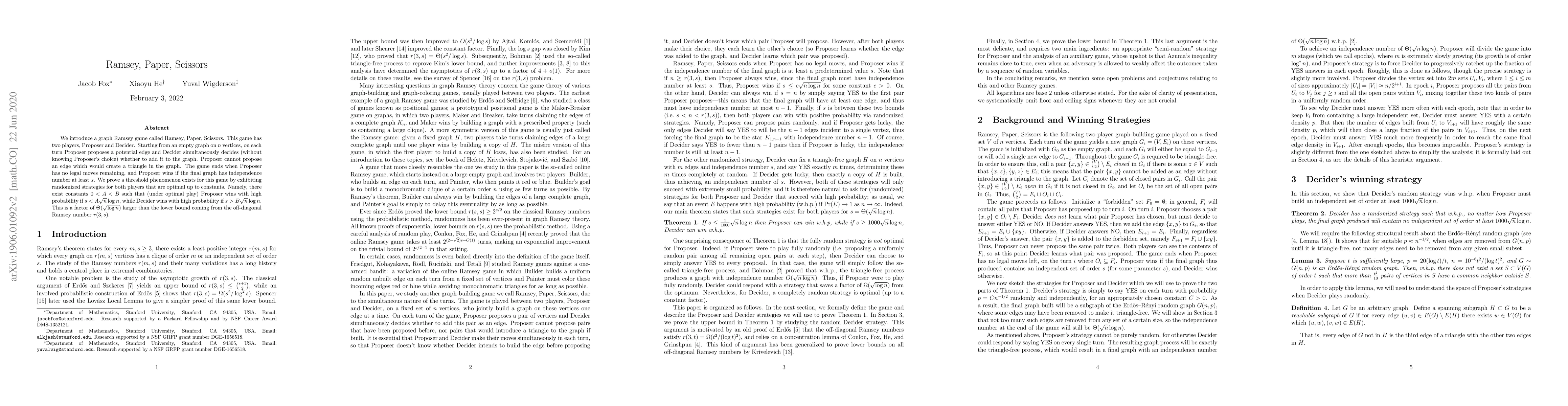 We introduce a graph Ramsey game called Ramsey, Paper, Scissors. This game has two players, Proposer and Decider. Starting from an empty graph on $n$ vertices, on each turn Proposer proposes a potential edge and Decider simultaneously decides (without knowing Proposer's choice) whether to add it to the graph. Proposer cannot propose an edge which would create a triangle in the graph. The game ends when Proposer has no legal moves remaining, and Proposer wins if the final graph has independence number at least $s$. We prove a threshold phenomenon exists for this game by exhibiting randomized strategies for both players that are optimal up to constants. Namely, there exist constants $0B\sqrt{n}\log{n}$. This is a factor of $\Theta(\sqrt{\log{n}})$ larger than the lower bound coming from the off-diagonal Ramsey number $r(3,s)$.