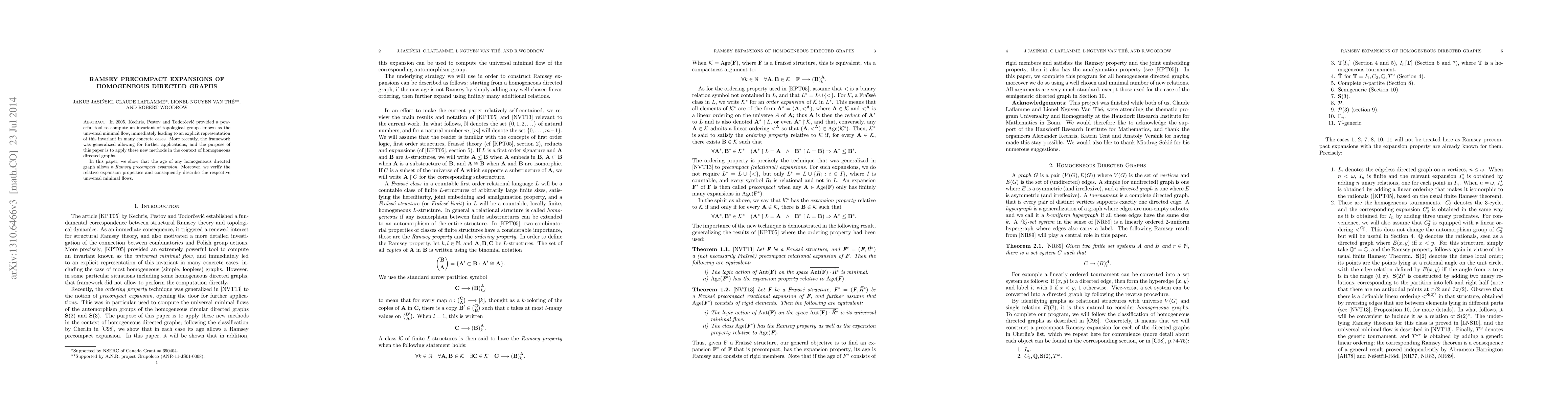 This paper extends the framework of Ramsey precompact expansions to homogeneous directed graphs, demonstrating that their age admits such expansions. It also verifies the relative expansion properties and describes the associated universal minimal flows.