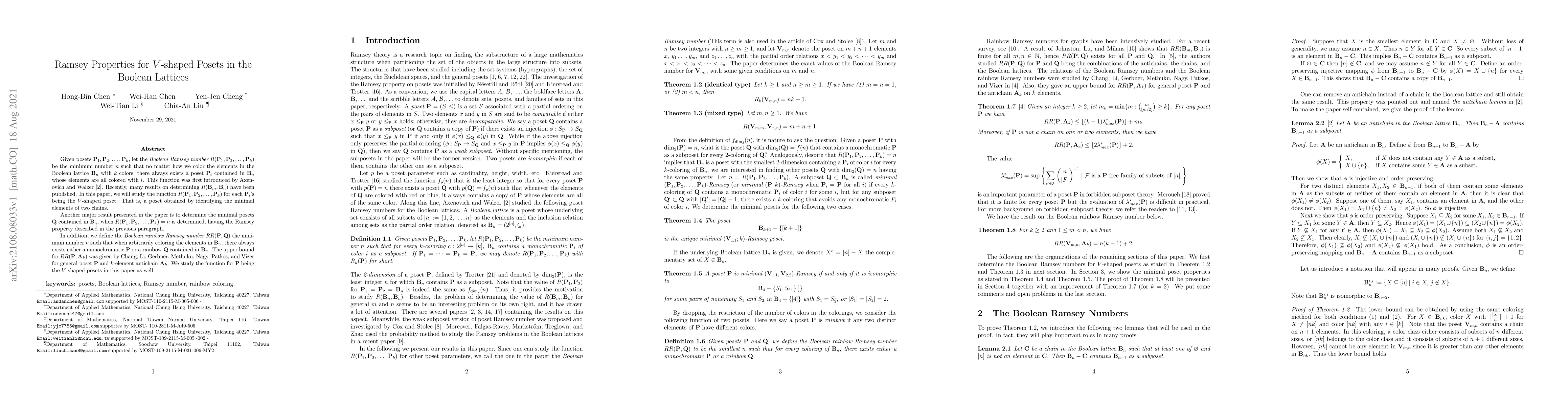 The paper studies Ramsey properties for $V$-shaped posets in Boolean lattices, determining the minimum number of elements needed to guarantee a specific colored structure, with implications for rainbow Ramsey numbers.