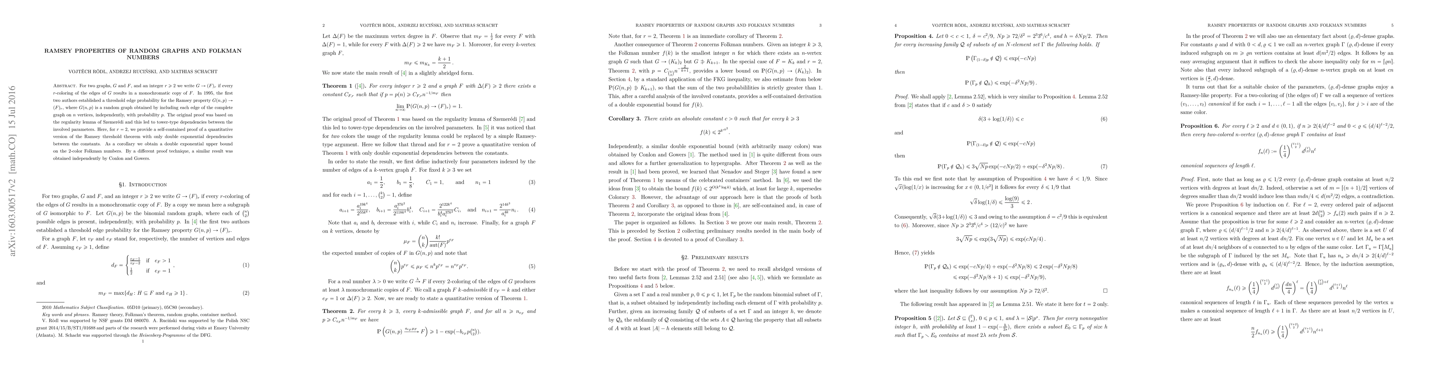 This paper provides a self-contained proof for the Ramsey property of random graphs with double exponential dependencies, improving upon previous tower-type dependency results. It also establishes a double exponential upper bound on the 2-color Folkman numbers as a corollary.
