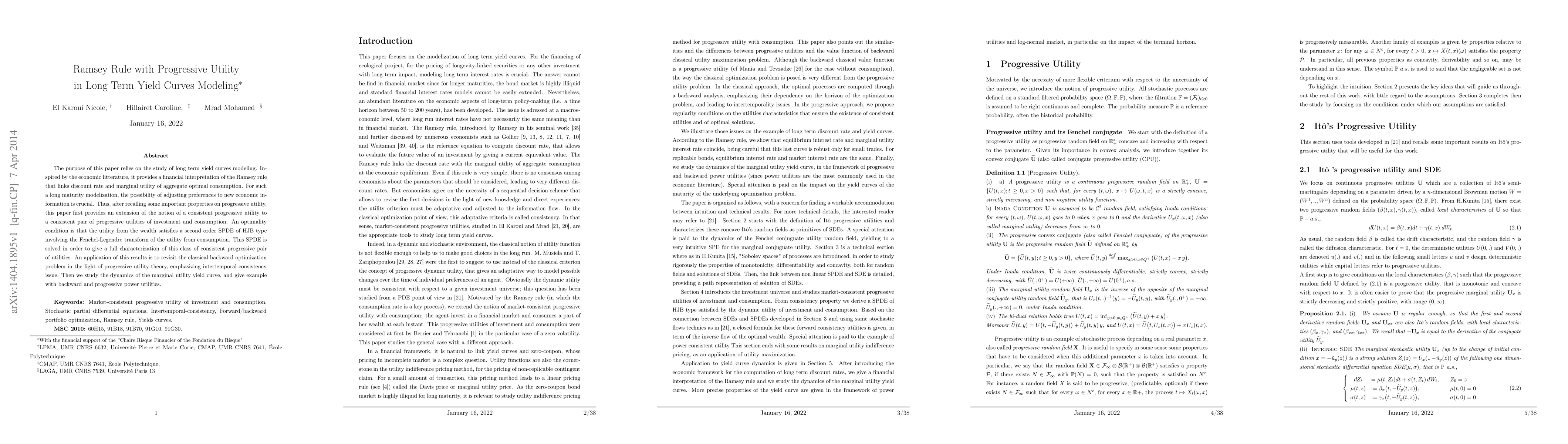 This paper models long term yield curves using the Ramsey rule and progressive utility, extending the notion of progressive utility to investment and consumption. It characterizes the optimal utility conditions through a second-order SPDE and applies these findings to revisit the backward optimization problem, emphasizing intertemporal consistency.