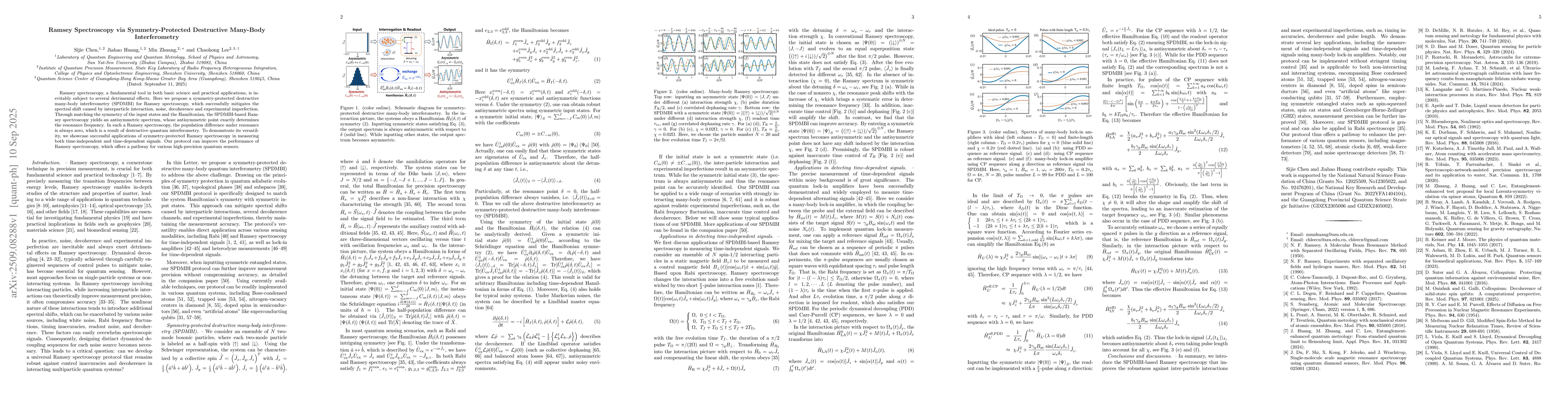 Ramsey spectroscopy, a fundamental tool in both basic science and practical applications, is inevitably subject to several detrimental effects. % Here we propose a symmetry-protected destructive many-body interferometry (SPDMBI) for Ramsey spectroscopy, which successfully mitigates the spectral shift caused by interparticle interaction, noise, decoherence and experimental imperfection. % Through matching the symmetry of the input states and the Hamiltonian, the SPDMBI-based Ramsey spectroscopy yields an antisymmetric spectrum, whose antisymmetric point exactly determines the resonance frequency. % In such a Ramsey spectroscopy, the population difference under resonance is always zero, which is a result of destructive quantum interferometry. % To demonstrate its versatility, we showcase successful applications of symmetry-protected Ramsey spectroscopy in measuring both time-independent and time-dependent signals. % Our protocol can improve the performance of Ramsey spectroscopy, which offers a pathway for various high-precision quantum sensors.