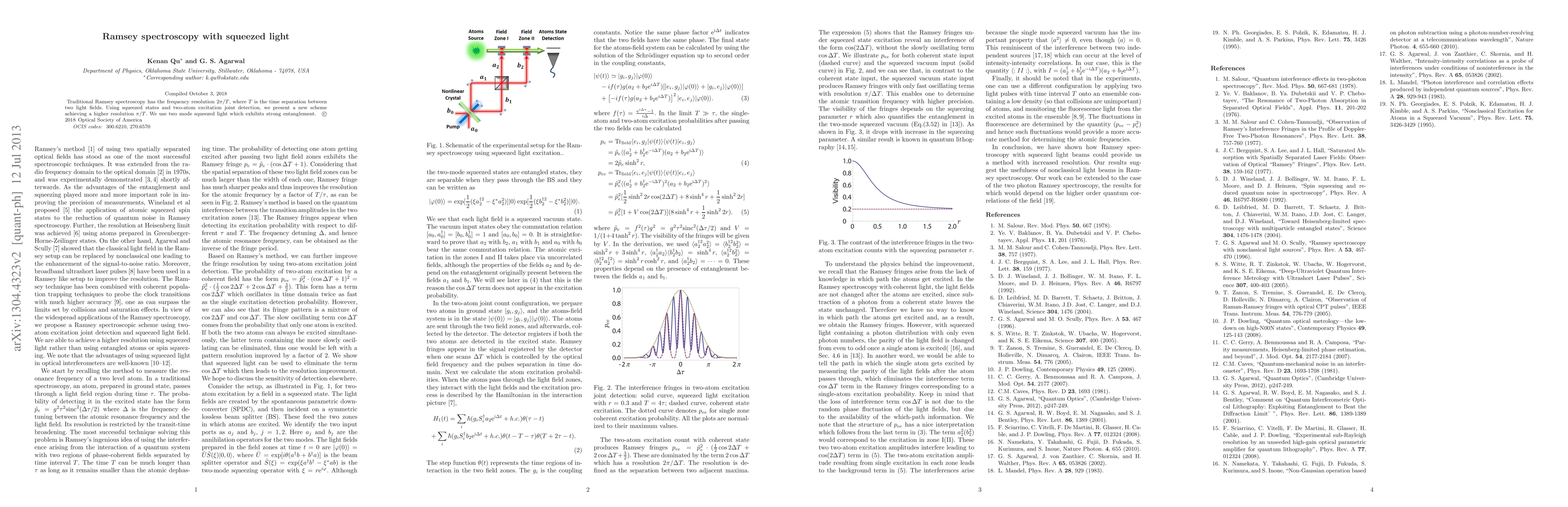 This paper proposes a novel Ramsey spectroscopy technique utilizing squeezed light to enhance frequency resolution, achieving $\pi/T$ compared to the traditional $2\pi/T$, by employing entangled two-mode squeezed states and joint detection of two-atom excitations.
