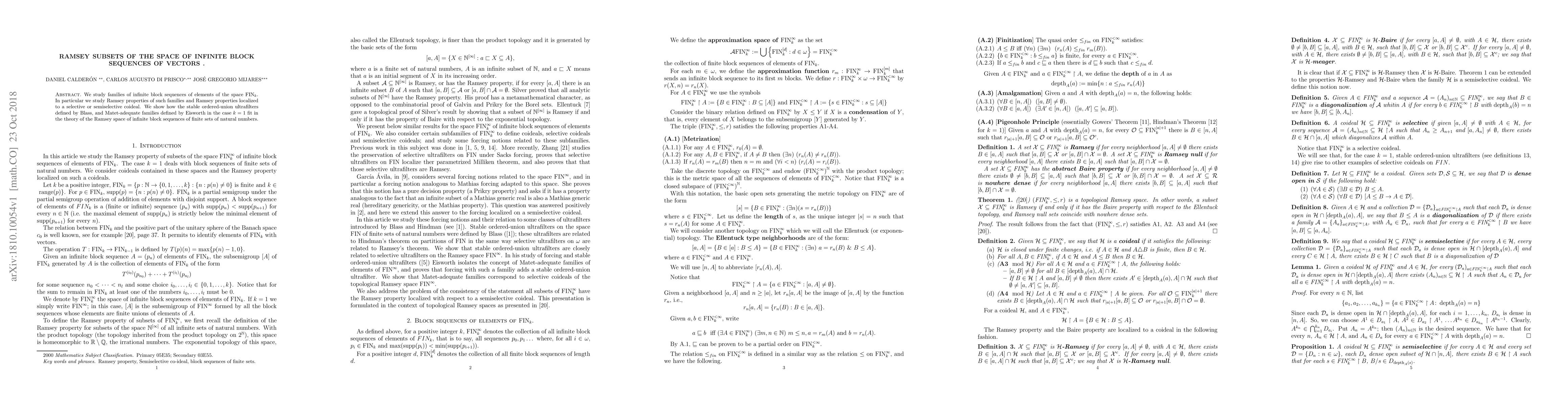 This paper explores Ramsey properties of families of infinite block sequences of finite sets of natural numbers, focusing on how stable ordered-union ultrafilters and Matet-adequate families fit within the broader theory of Ramsey spaces. It also examines localized Ramsey properties in selective or semiselective coideals.